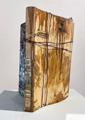 oil, acrylic, blood, wood, charcoal, masonite, drywall screws, nail polish, mixed media 21 x 15.37 x 13.75 inches