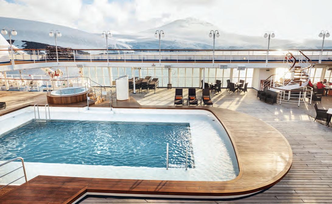 • Auf acht Decks befinden sich mehrere Restaurants, Bars und Lounges, ein weitläufiges Spa, ein zweistöckiges Solarium mit Swimmingpool und Whirlpool, und eine Reihe an Beobachtungsbereichen