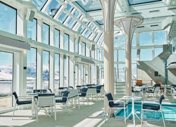 An extraordinary two-storey, glass-enclosed atrium boasts aweinspiring views and houses the ship’s pool and whirlpool. Casual dining on international fare at The Grill is also on offer here.