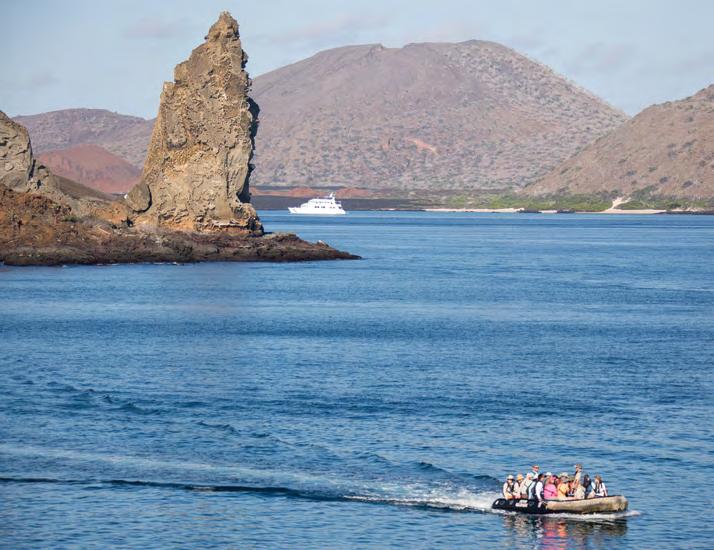 Eine Zodiac-Kreuzfahrt um die Isla Bartolomé, mit der Silver Origin am Horizont
