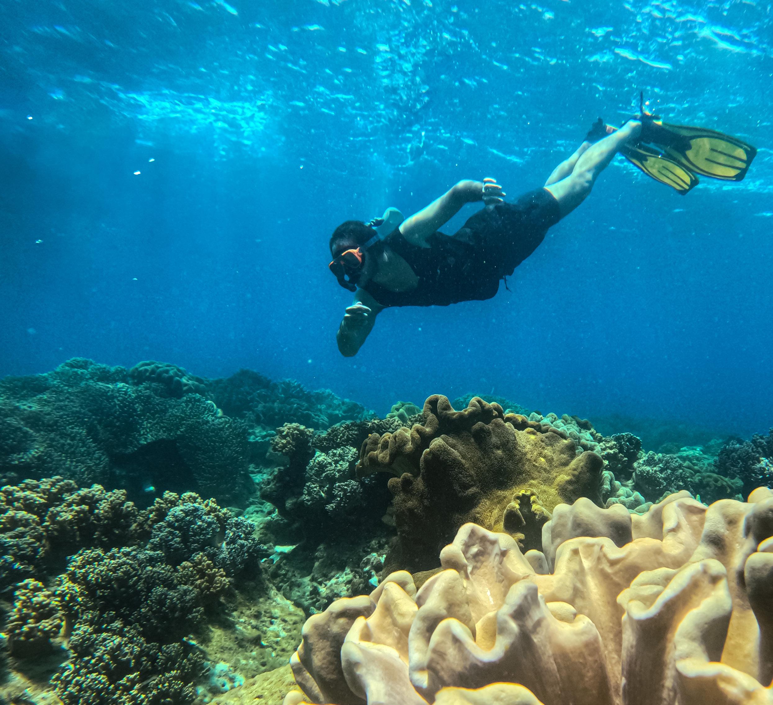 • Discover coral gardens teeming with shoals of vibrant reef fish