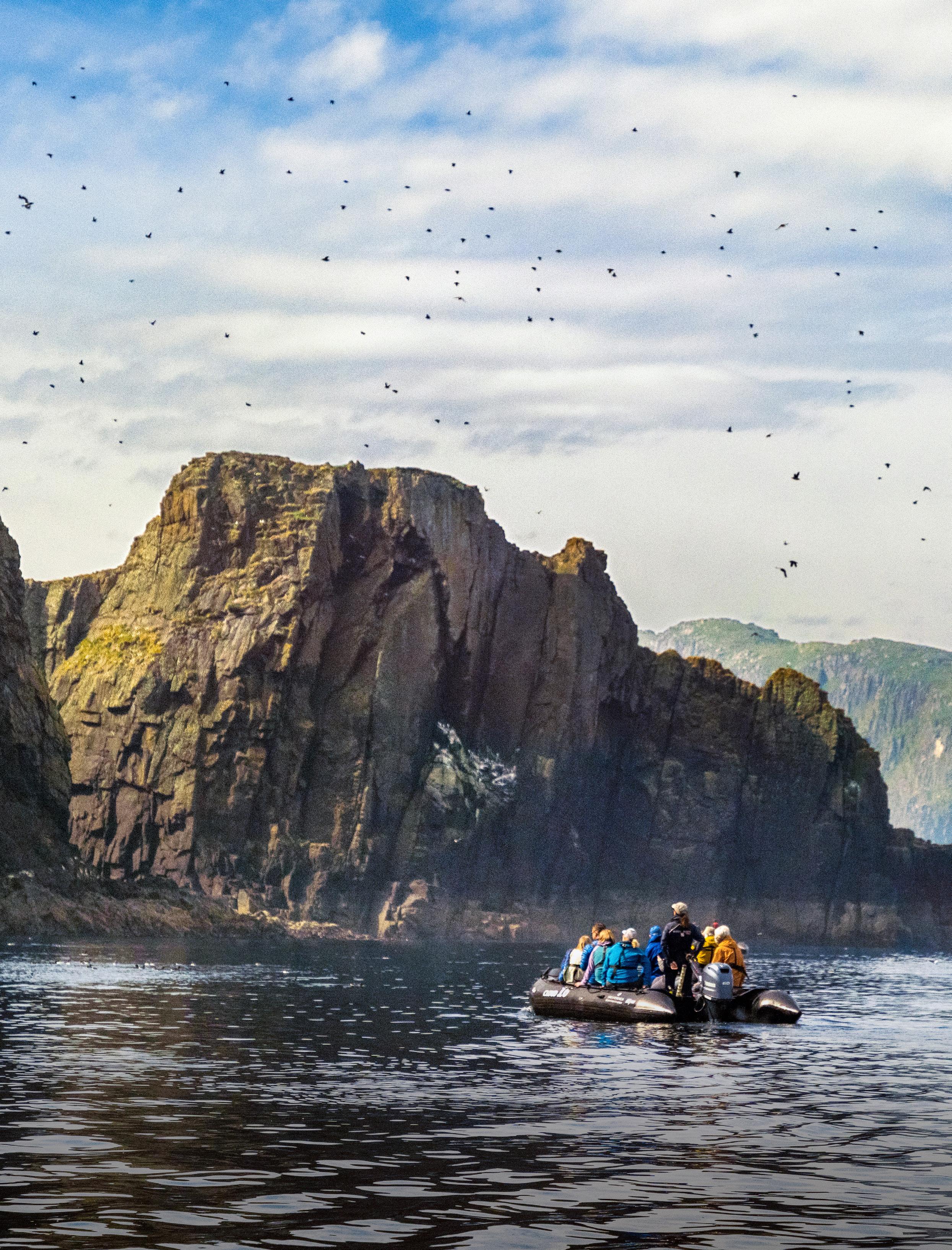 • Zip along misty fjords past towering bird cliffs on a Zodiac.