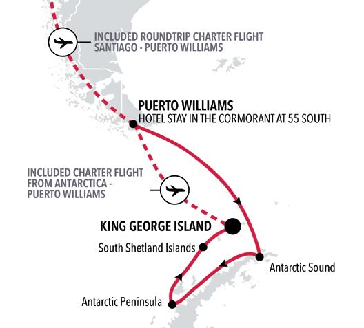 • Private Business Class roundtrip flight to King George Island; pre/ post-voyage hotel night.