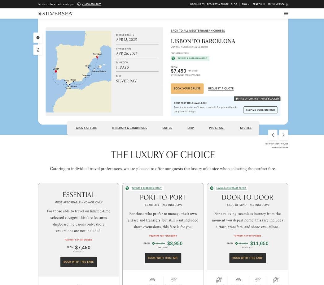 MEDITERRANEAN CRUISE: Comparisons based on the following voyages: Silversea Silver Ray 7-night voyage, June 7, 2026, (Classic Veranda Suite); Holland America Oosterdam, 7-night voyage, June 14, 2026, (Signature Suite); Viking Mira, 8-night voyage, June 5, 2026, (Penthouse Veranda (PV1); Oceania Sirena, 7-night voyage, June 9, 2026, (A1- Concierge Level Veranda). Pricing sourced from individual cruise line websites and reservation centers. *Silversea Pre- and Post-Hotel stays are included, depending on Silversea’s air program flight schedule. **Silversea offer presented is based on our Door-to-Door pricing model and is inclusive of all services presented. Competitor inclusion rates were acquired from the respective website if the competitor chooses to make such an inclusion available. Otherwise, airfares, hotels, ground transfers and onboard gratuities are left to the guest’s discretion.