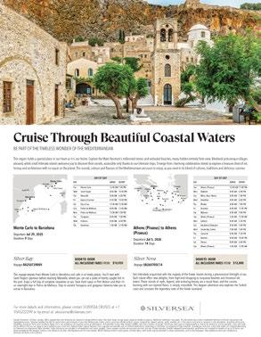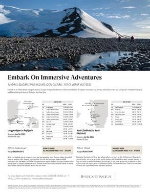 GENERAL EXCLUSIONS: All fares, savings, offers, programs and itineraries are subject to change without notice. Any fares shown are per guest, based on double-occupancy. Additional restrictions may apply. Silversea reserves the right to correct any errors or omissions. Visit www.Silversea.com/terms-andconditions.html for full offer details and complete Terms and Conditions. This document may contain inadvertent technical or factual inaccuracies and typographical errors. Silversea reserves the right to correct errors and omissions at any time without prior notice, and to cancel any offered product, service, program, reward, savings, credit, amenity, etc. in the event of any error or omission in the description, including pricing and availability. 20250128