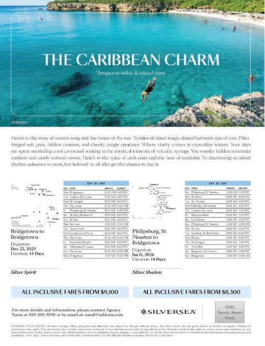 GENERAL EXCLUSIONS: All fares, savings, offers, programs and itineraries are subject to change without notice. Any fares shown are per guest, based on double-occupancy. Additional restrictions may apply. Silversea reserves the right to correct any errors or omissions. Visit www.Silversea.com/terms-andconditions.html for full offer details and complete Terms and Conditions. This document may contain inadvertent technical or factual inaccuracies and typographical errors. Silversea reserves the right to correct errors and omissions at any time without prior notice, and to cancel any offered product, service, program, reward, savings, credit, amenity, etc. in the event of any error or omission in the description, including pricing and availability. 20250128