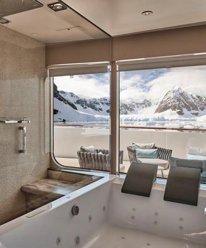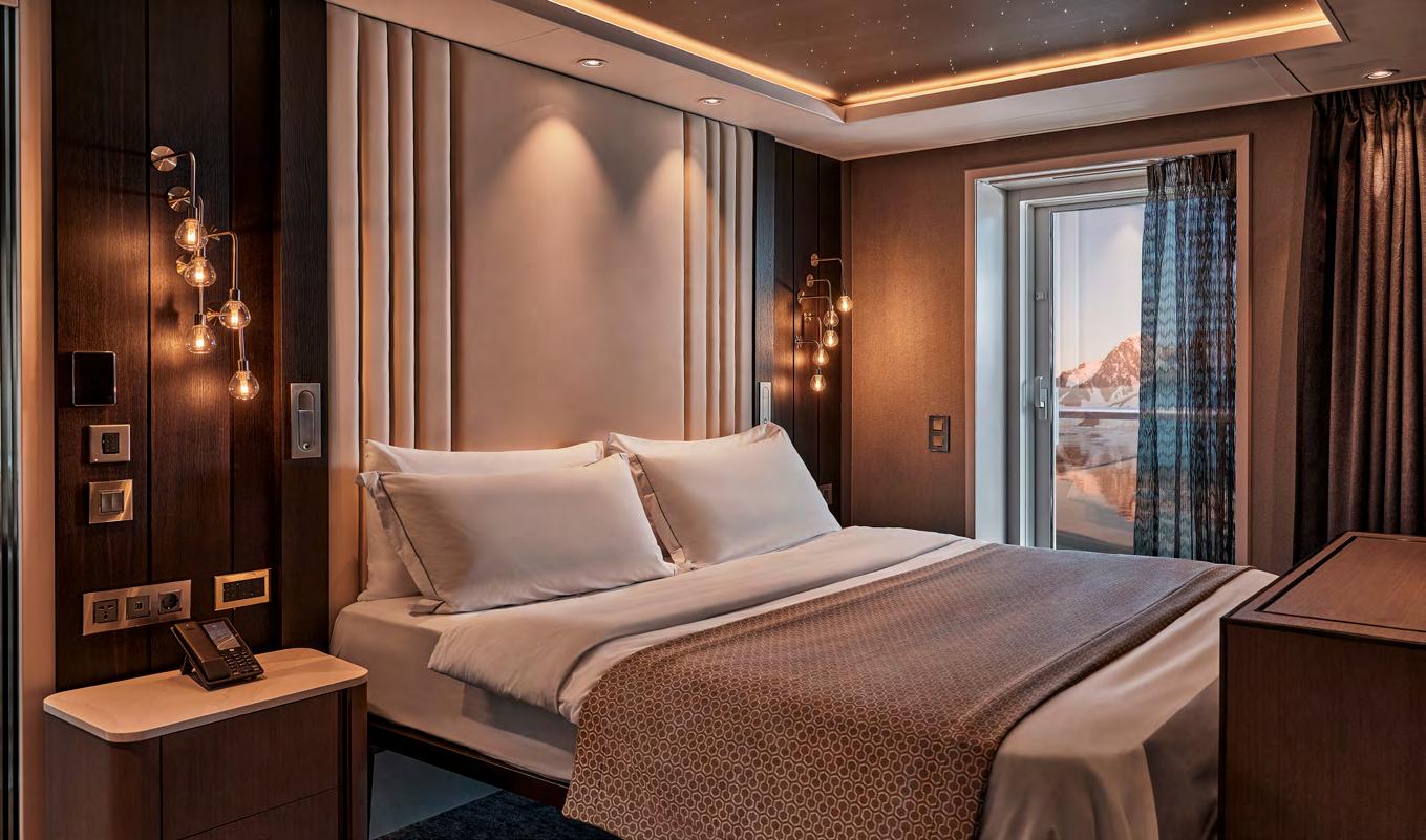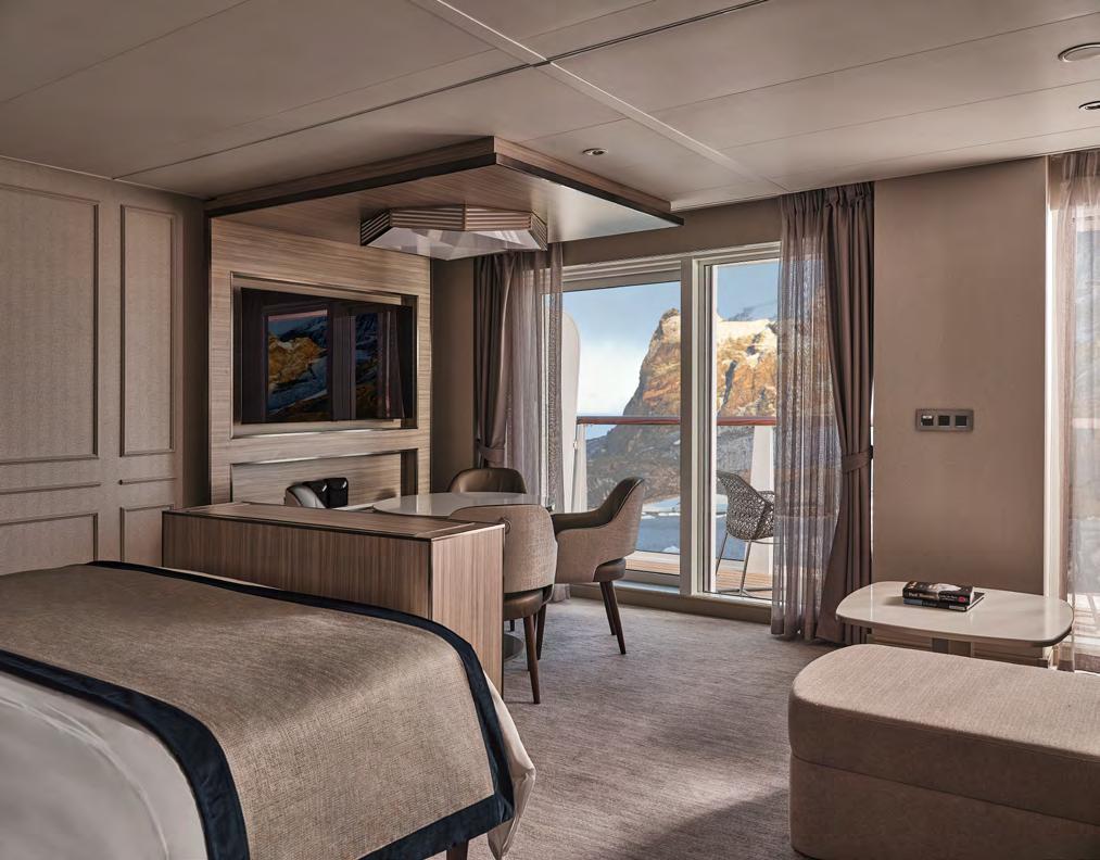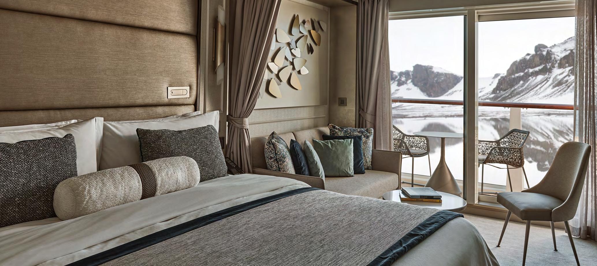 feature a spacious private balcony and floor-to-ceiling glass windows for an unobstructed connection with each destination. Sophisticated interiors are well appointed with all the amenities needed for expedition cruising as well as a bevy of indulgent luxuries to create an elegant retreat following extraordinary adventures ashore.
