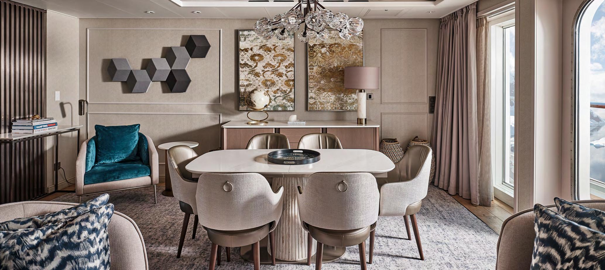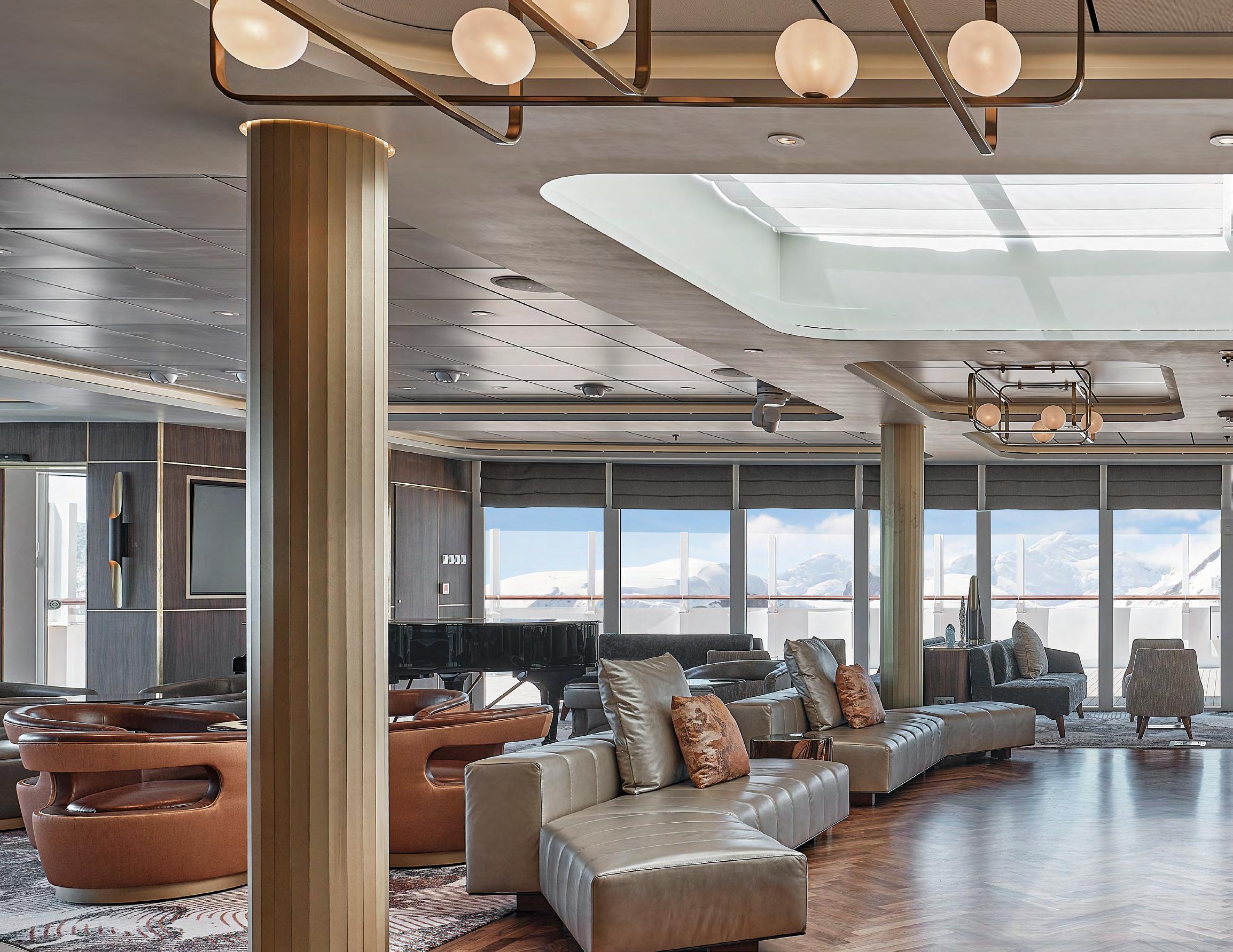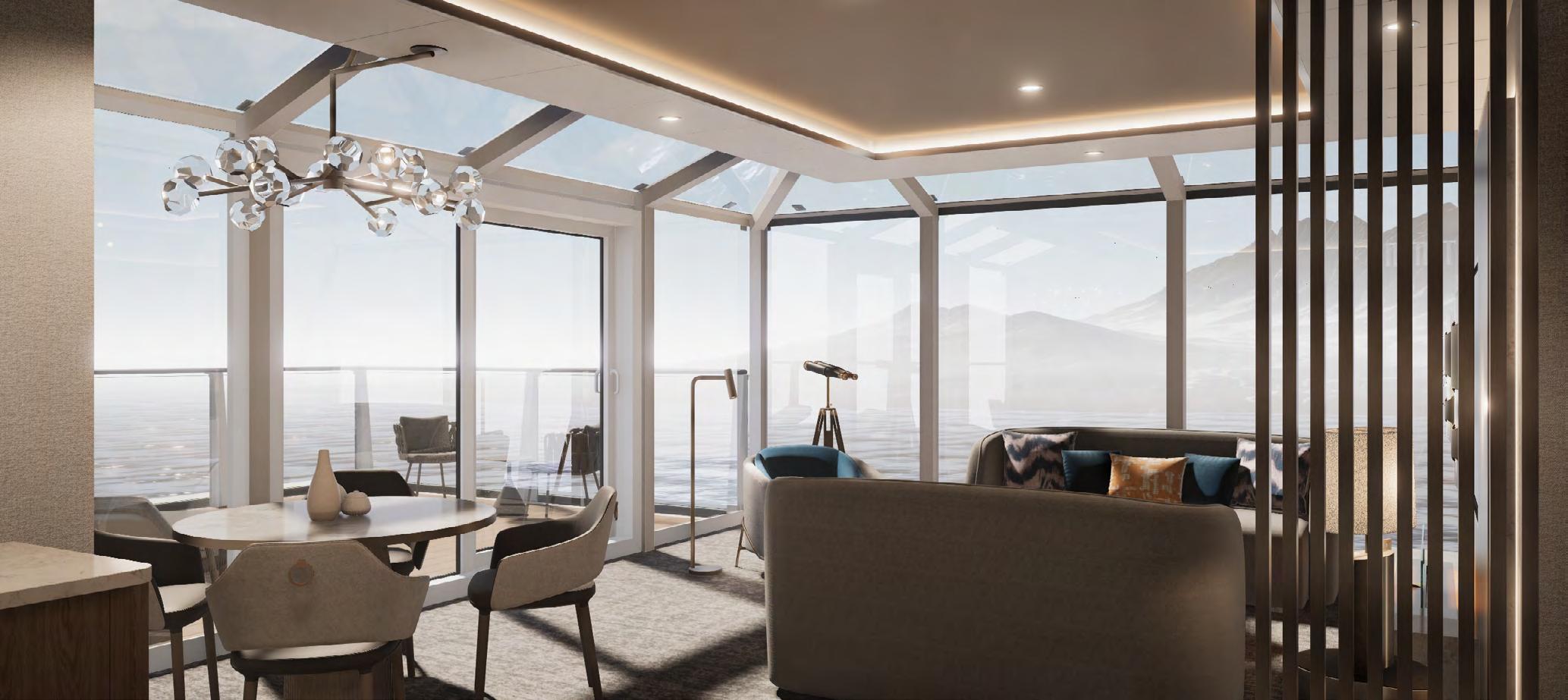 feature a spacious private balcony and floor-to-ceiling glass windows for an unobstructed connection with each destination. Sophisticated interiors are well appointed with all the amenities needed for expedition cruising as well as a bevy of indulgent luxuries to create an elegant retreat following extraordinary adventures ashore.