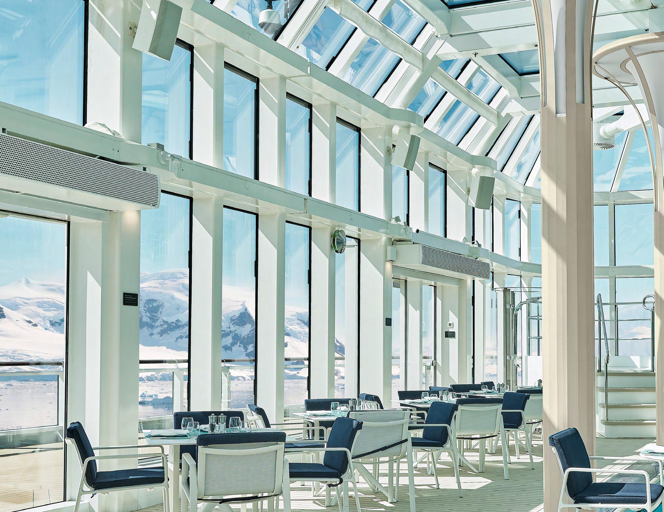 Spread over eight public decks, Silver Endeavour boasts some of the most luxuriously spacious interiors in expedition cruising, fostering a welcoming ambience and easy guest interaction. Extraordinary light fills bars and lounges. The expansive Otium Spa offers pampering treatments –and fantastic views. And a two-storey, glass-enclosed atrium sits aft, housing a pool and whirlpool and showcasing 270° panoramas of astounding scenery and wildlife.