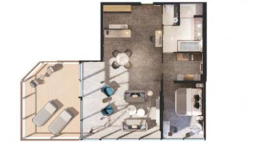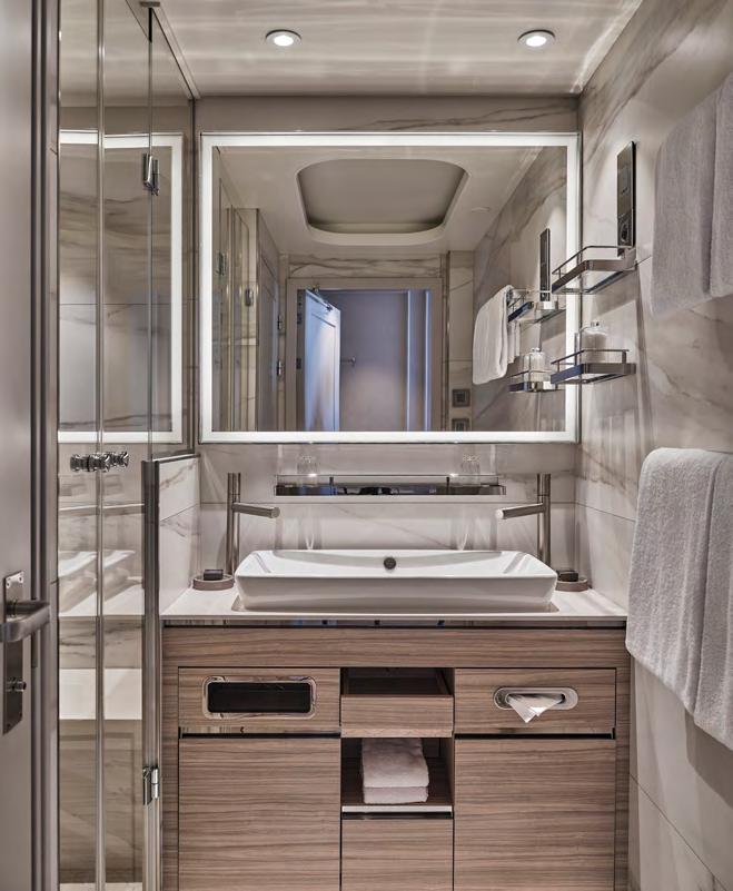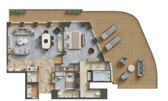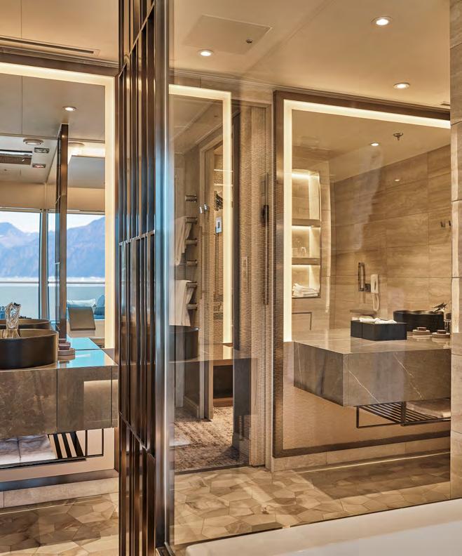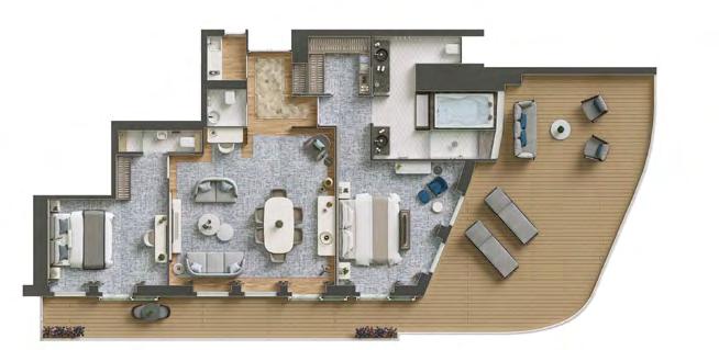 The Master Suite offers complete destination immersion at sea. Floor-to-ceiling windows plus domed glazing and one of the largest balconies on board provide wow-factor 270˚ views, while the spacious living and dining areas, separate bedroom and bathroom with walk in shower and whirlpool bath ensure complete in-suite comfort.