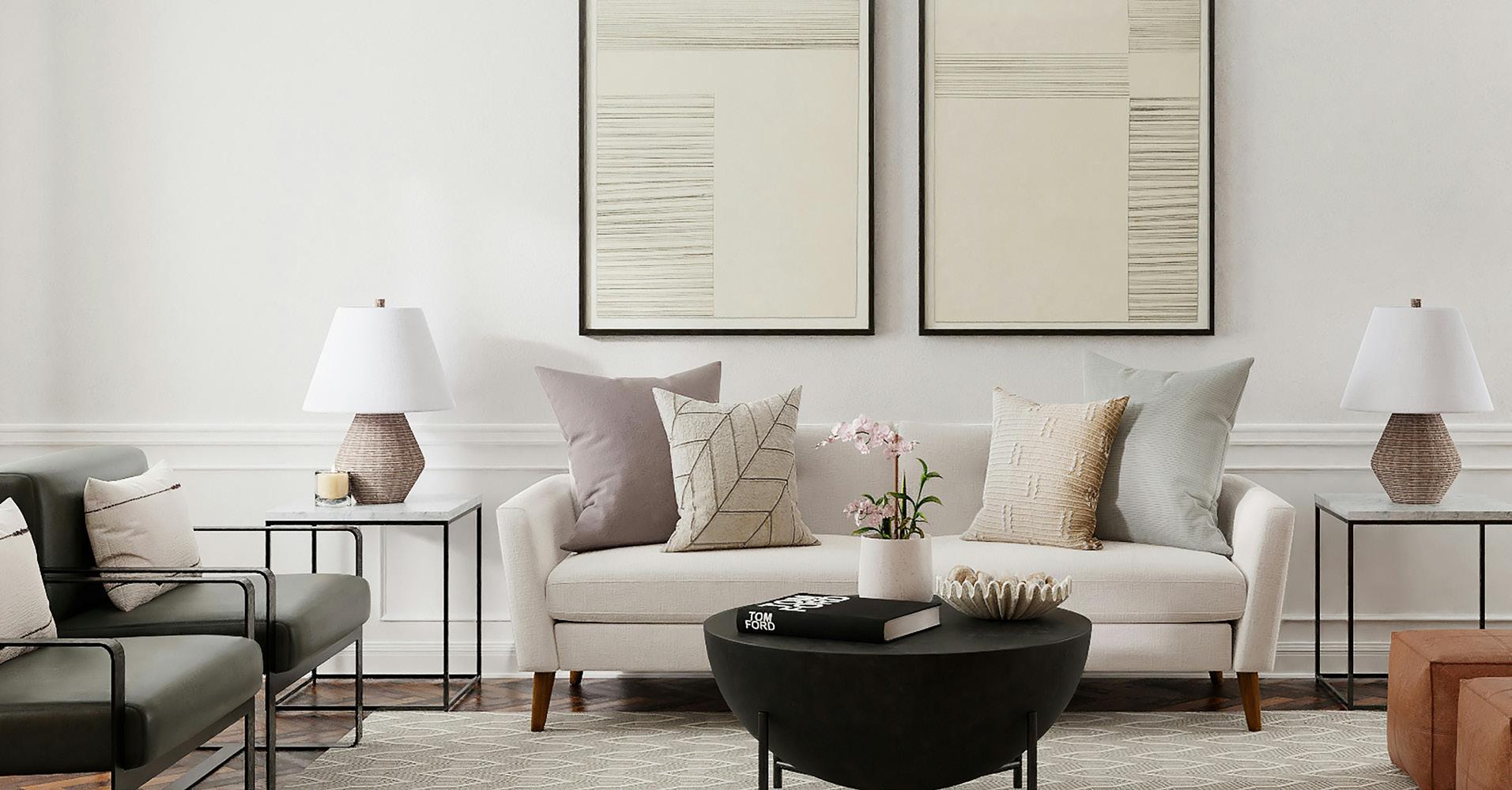 Telas como el lino y el algodón, asi como estampados geométricos y orgánicos como acento para la decoración.
