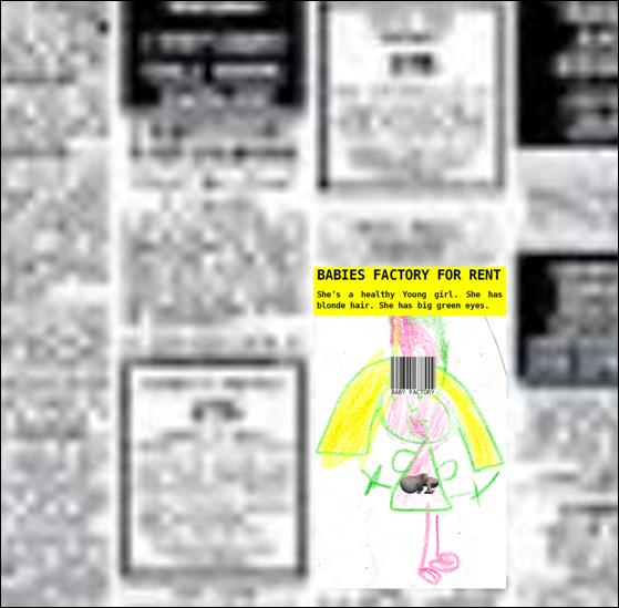 La compra de bebés es a la carta. Se puede elegir la genética del bebé y obtener un producto final al gusto y manera del comprador. El objeto producido, deja de ser entonces considerado como persona, es un objeto de consumo, una posesión. Las gestantes tampoco son consideradas personas. Se las ignora e instrumentaliza en el proceso. Dejan de ser humanas, son materia prima. Prueba con esta instalación a hacer combinaciones de esa materia prima. Enciende y apaga los botones...