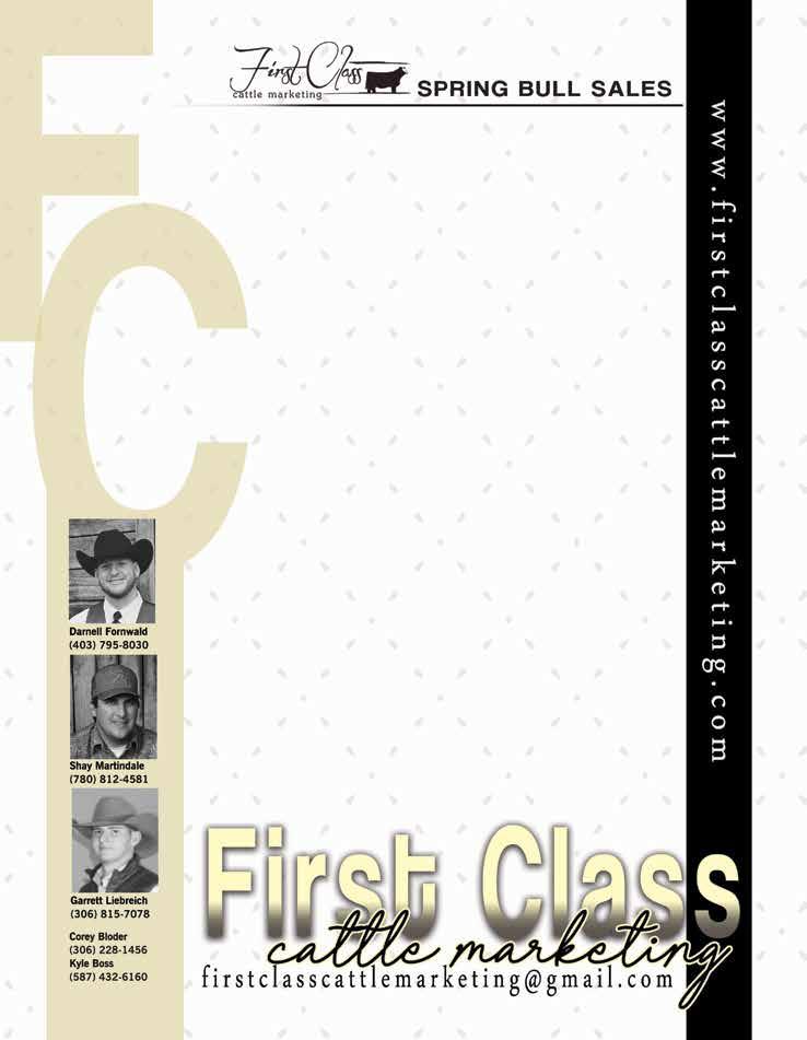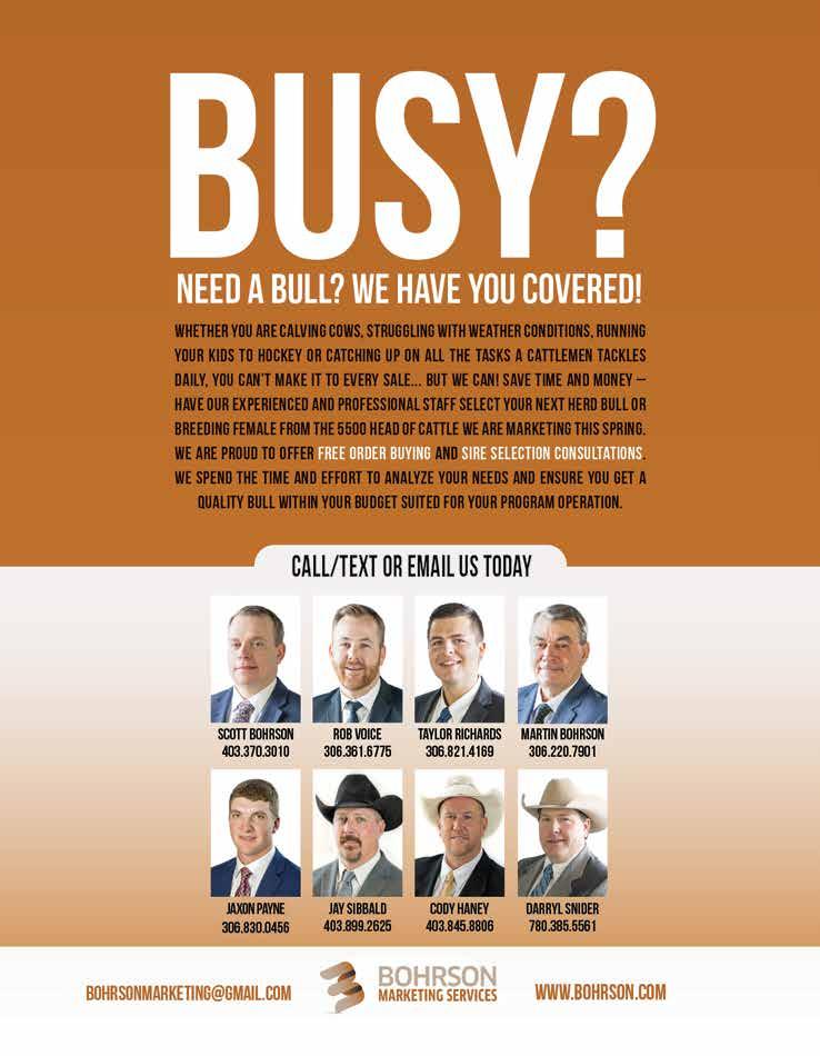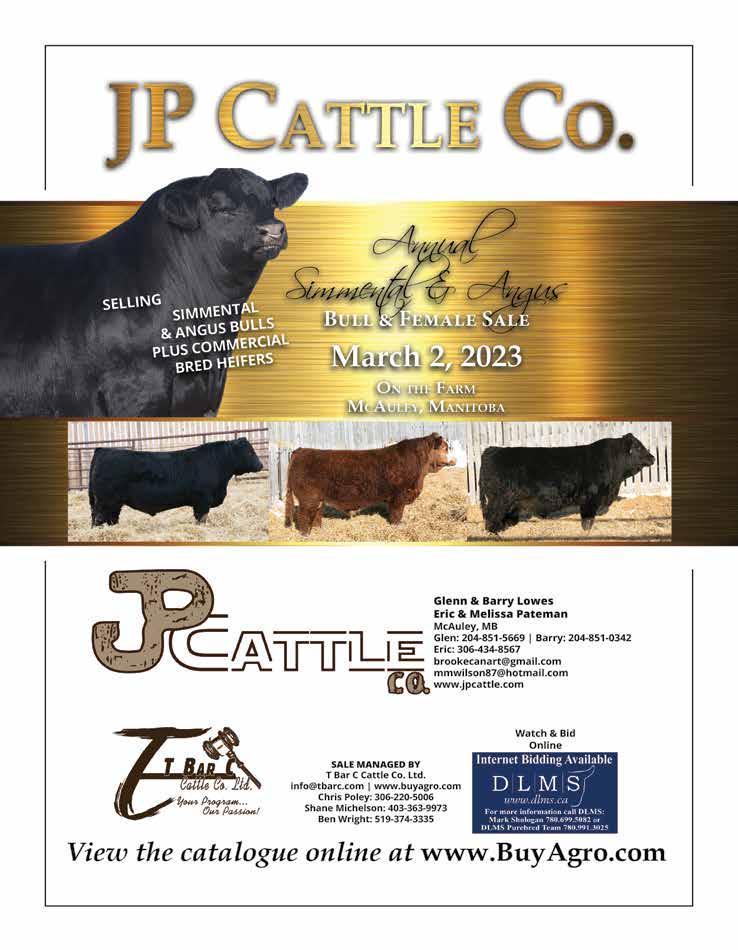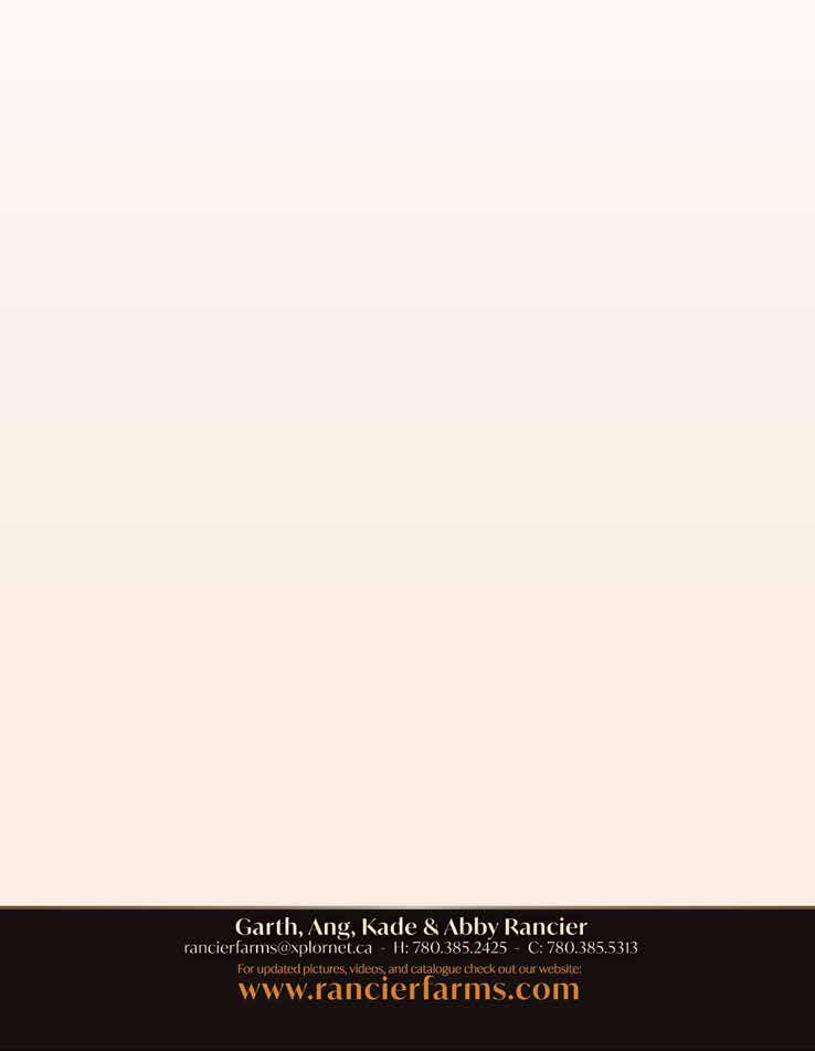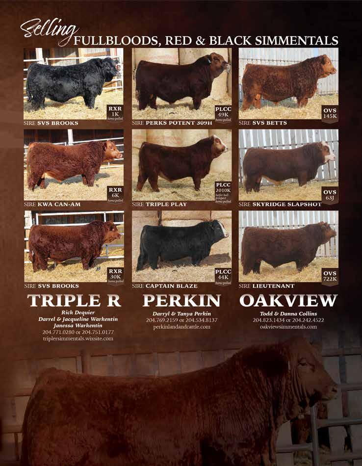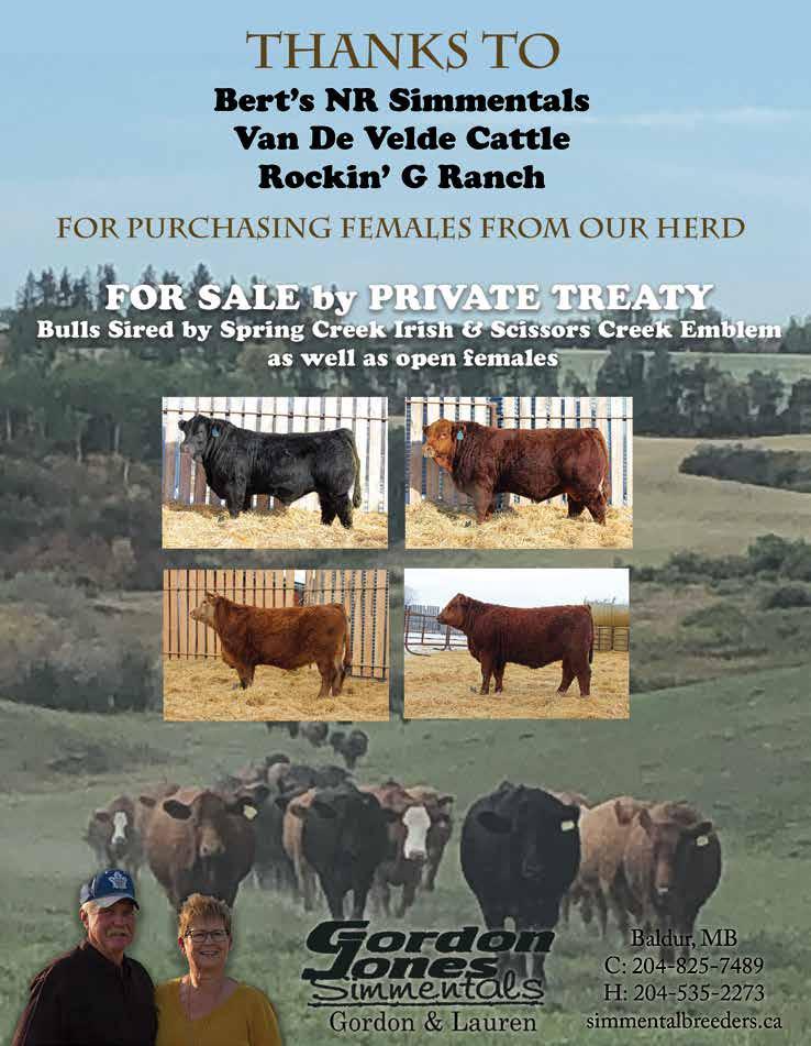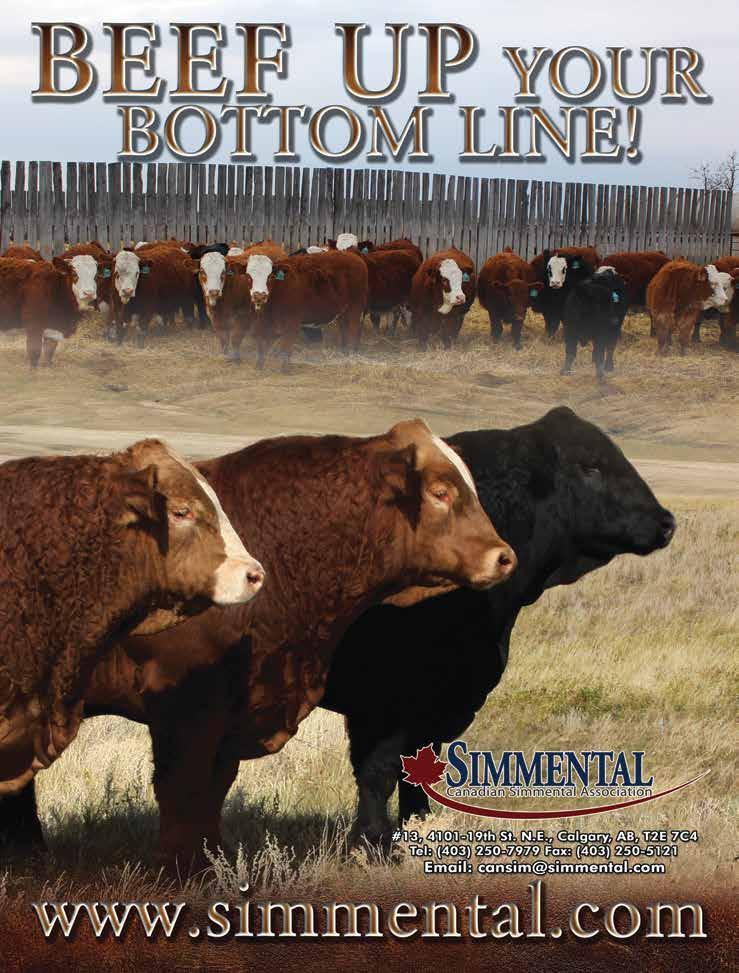 Davis Livestock Services * Marketing Consultant * Photography * Order Buying Wilf Davis P.O. Box 177 Douglas, Manitoba R0K 0R0 Ph (204)834-2479 Fax (204)834-3999 Jackson.hbsf@gmail.com Simmental and CharolaiS The Jackson Family H: 1-204-564-2547 Carman cell: 1-204-773-6448 Erin: 1-204-821-4110 www.highbluffstockfarm.ca Box 517 Virden, MB R0M 2C0 Dale Studer Beef Sales Representative 204-748-1251 Cell: 204-512-0342 elainestuder@hotmail.com Your Success, Our Passion. Phil Unrau Beef/Bison Consultant Cell: 431-771-4210 phil.unrau@bullseyefeeds.ca Head Office- 126 E Canal Garden, Strathmore, AB T1P 1Y4 Toll Free: 1-833-210-8100 ext. 237 www.bullseyefeeds.ca THIS SPACE COULD BE YOURS! CONTACT JOANNE @ 204-750-2350 OR EMAIL SIMMENTAL.FOCUS@GMAIL.COM FOR DETAILS. 94-SIMMENTAL FOCUS