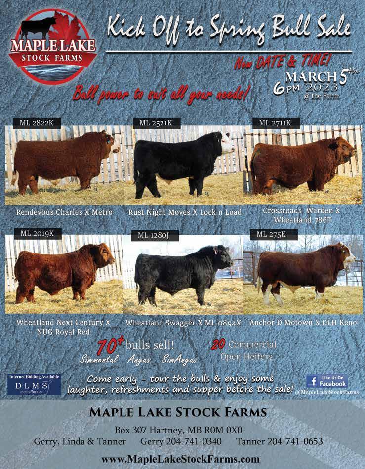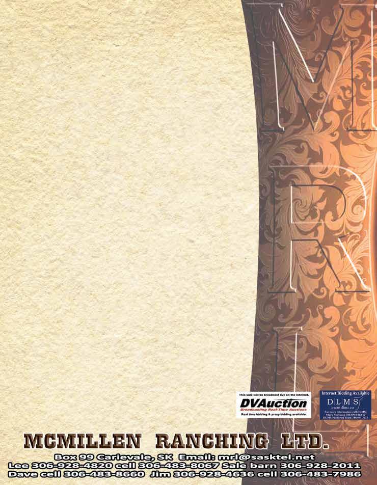 JOIN US AT THE FARM SALE DAY 1:30 PM - AT THE FARM - BRANDON, MB BLAIR, LOIS & MELISSA MCRAE 204-728-3058 - BLAIR 204-729-5439 - LOIS 204-573-5192 RED ANGUS | BLACK ANGUS | SIMMENTAL OFFERING 50 YEARLING & TWO YEAR OLD BULLS BULL SALE GeneticsYouCantrust! RAISING CATTLE THAT ADD VALUE FOR OUR CUSTOMERS gMCRAE LAND & LIVESTOCK Brett & Chantel McRae 204-729-1018 MC-THREE FARMS - Tyson McRae 204-726-3205 ANGUS VALLEY FARMS - Bruce McRae 204-242-4502 SPRINGHILL FARM - 506-470-8067 8TH 2023March SIMMENTAL - KOB 8K BLACK ANGUS TWO YEAR OLDS RED ANGUS @MARMACFARMS CATALOGUE & VIDEOS ONLINE AT MARMACFARMS.NET SIMMENTAL FOCUS-3