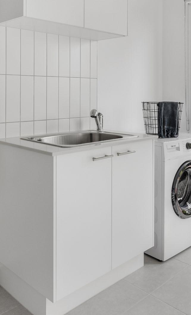 J Up to 900mm laundry cabinet with 33mm laminate benchtop, 45ltr stainless steel trough and veggie spray tap (space permitting).