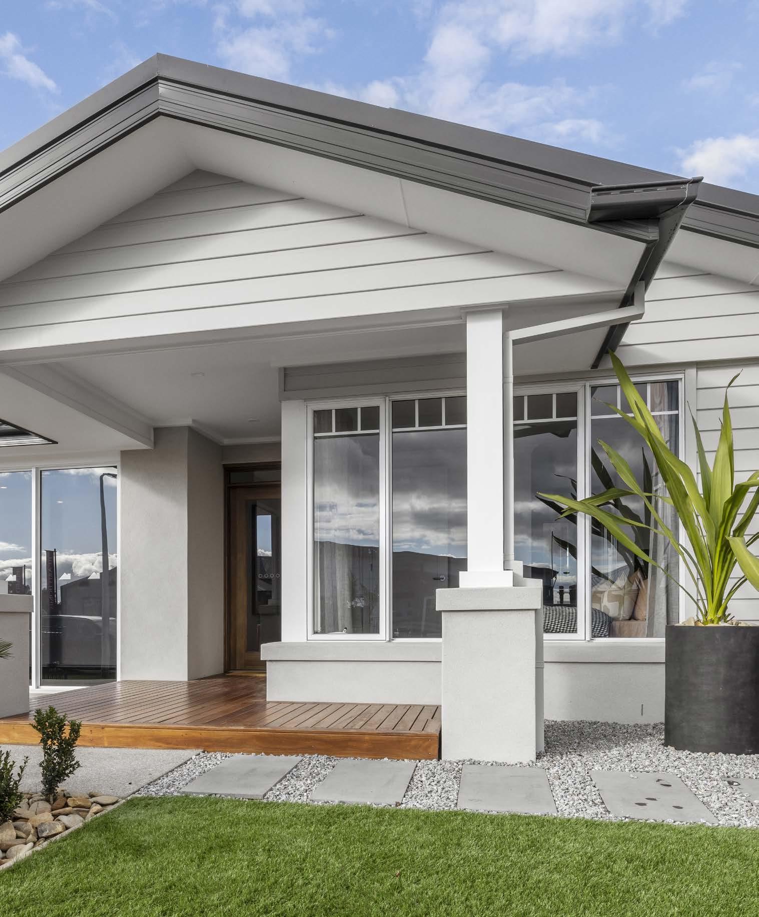 A Hamptons facade isn't complete without the use of timber detailing and trims with a subtle contrast. Think about how your window panes, porch pillars, fascias and gutters can create interest to your weatherboard exterior and accentuate your gable roofline.