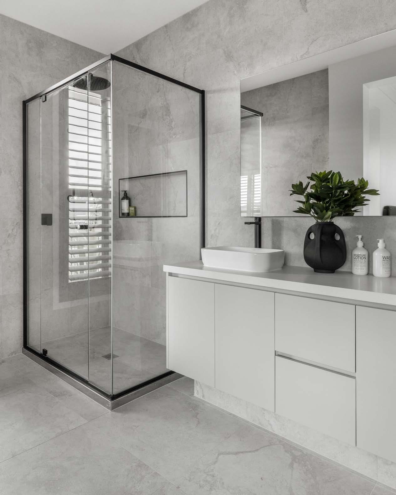 Designed to instil a sense of calm, you’ll often find frameless shower screens paired with smooth, freestanding bathtubs. Builtin niches provide discreet, streamlined storage solutions.