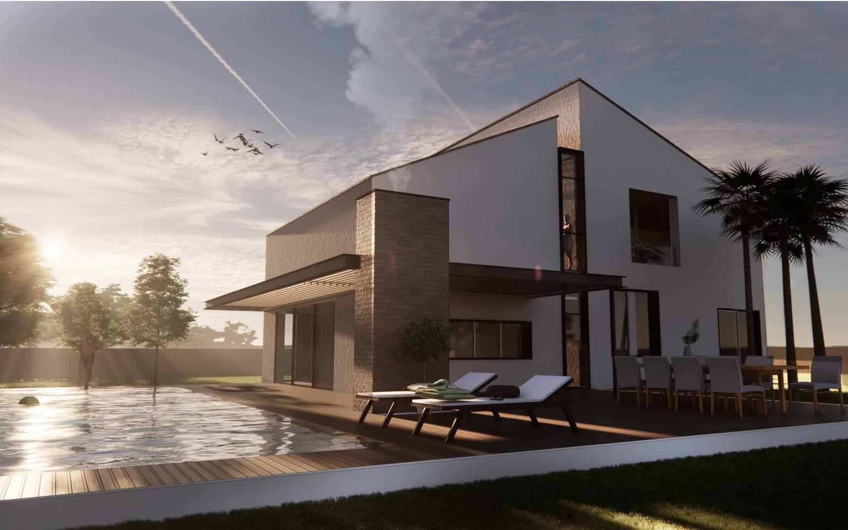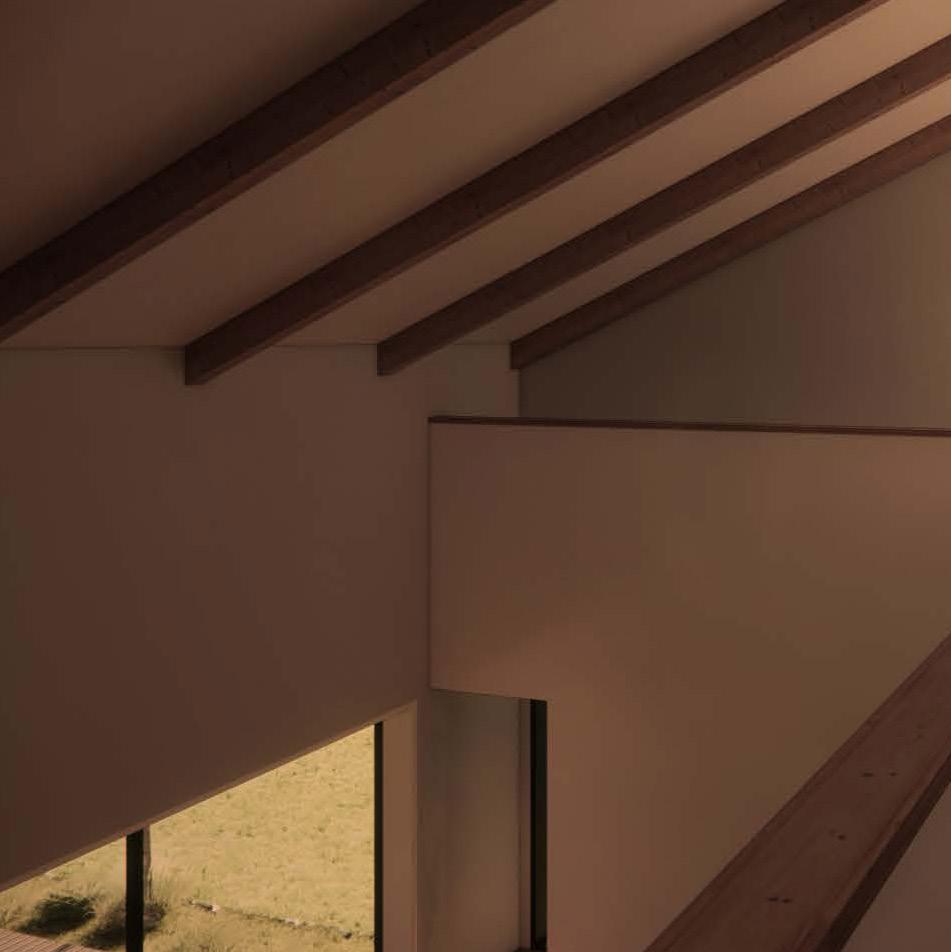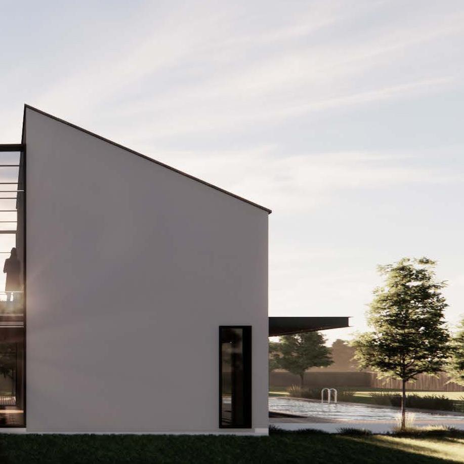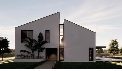 A villa in south Italy with a modern slopped rooftop, divided into public and private areas by a glass separation on the facades.