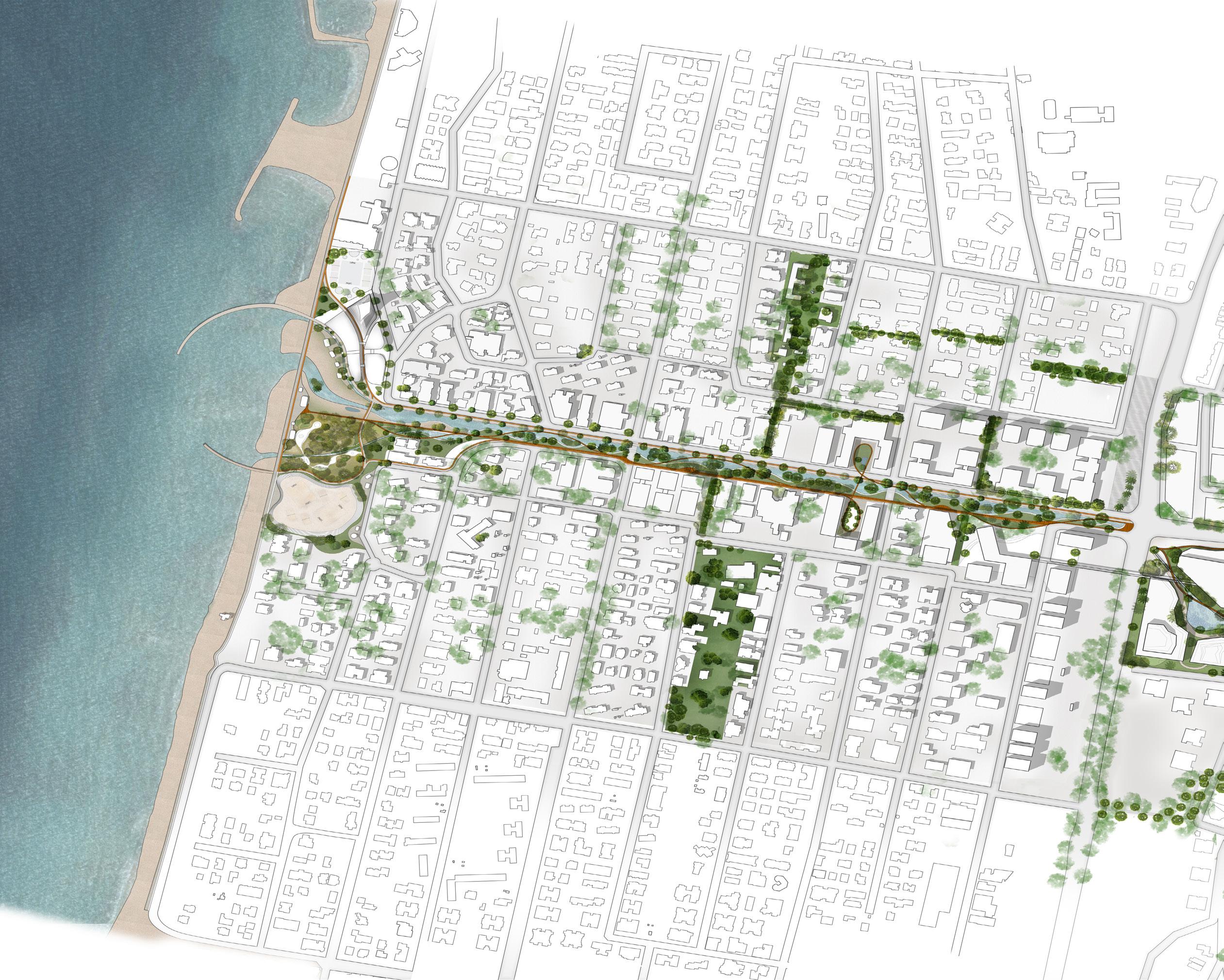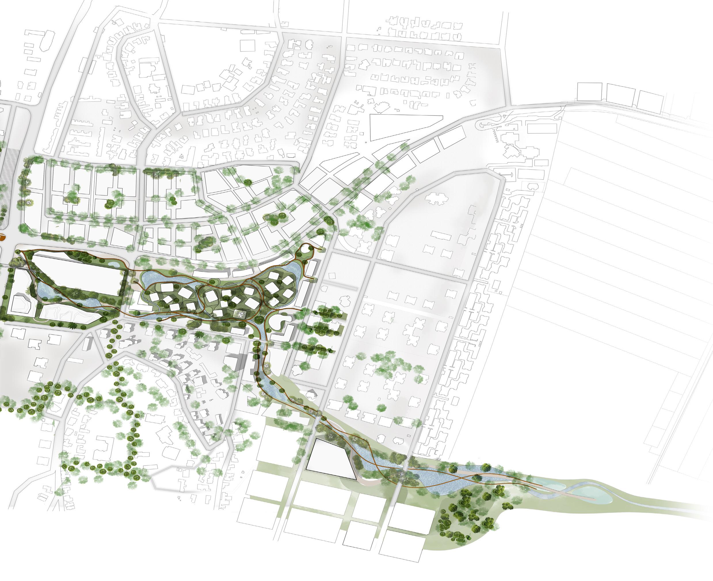 The proposal embraces a holistic approach to urban planning and design, incorporating the management of surface runoff in line with the hydrological characteristics of the drainage basin and viewing the stream as a valuable resource and nature-based