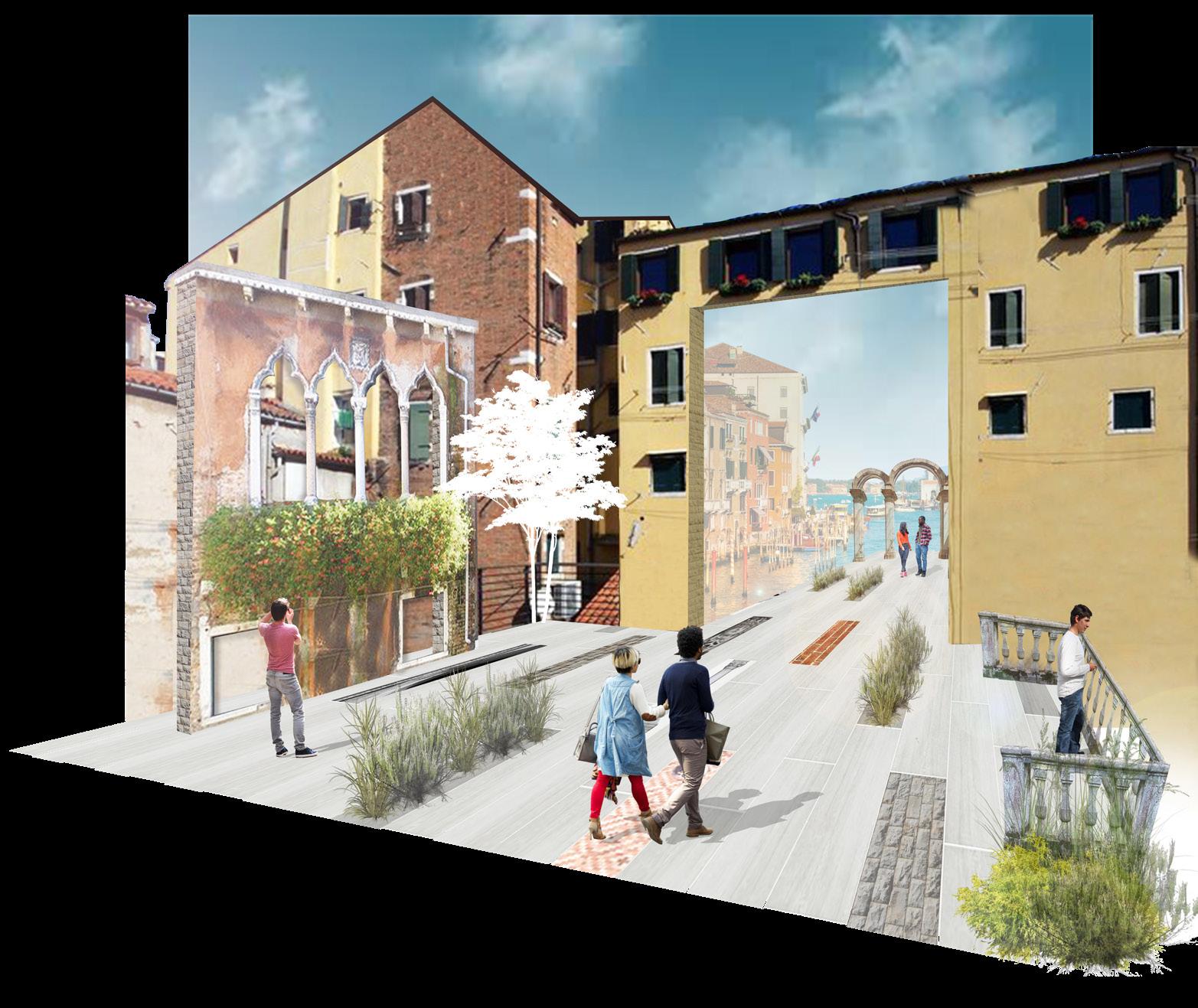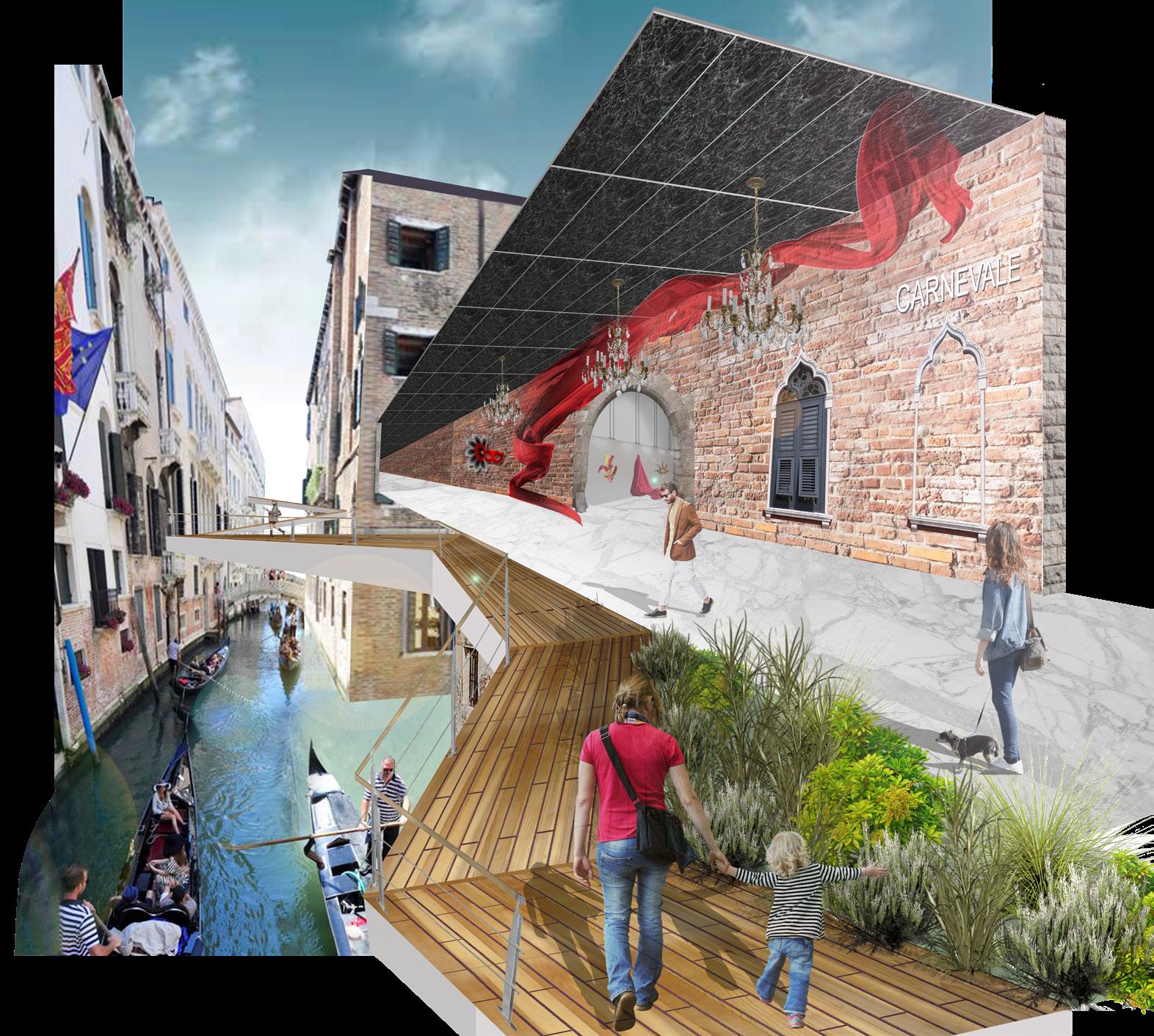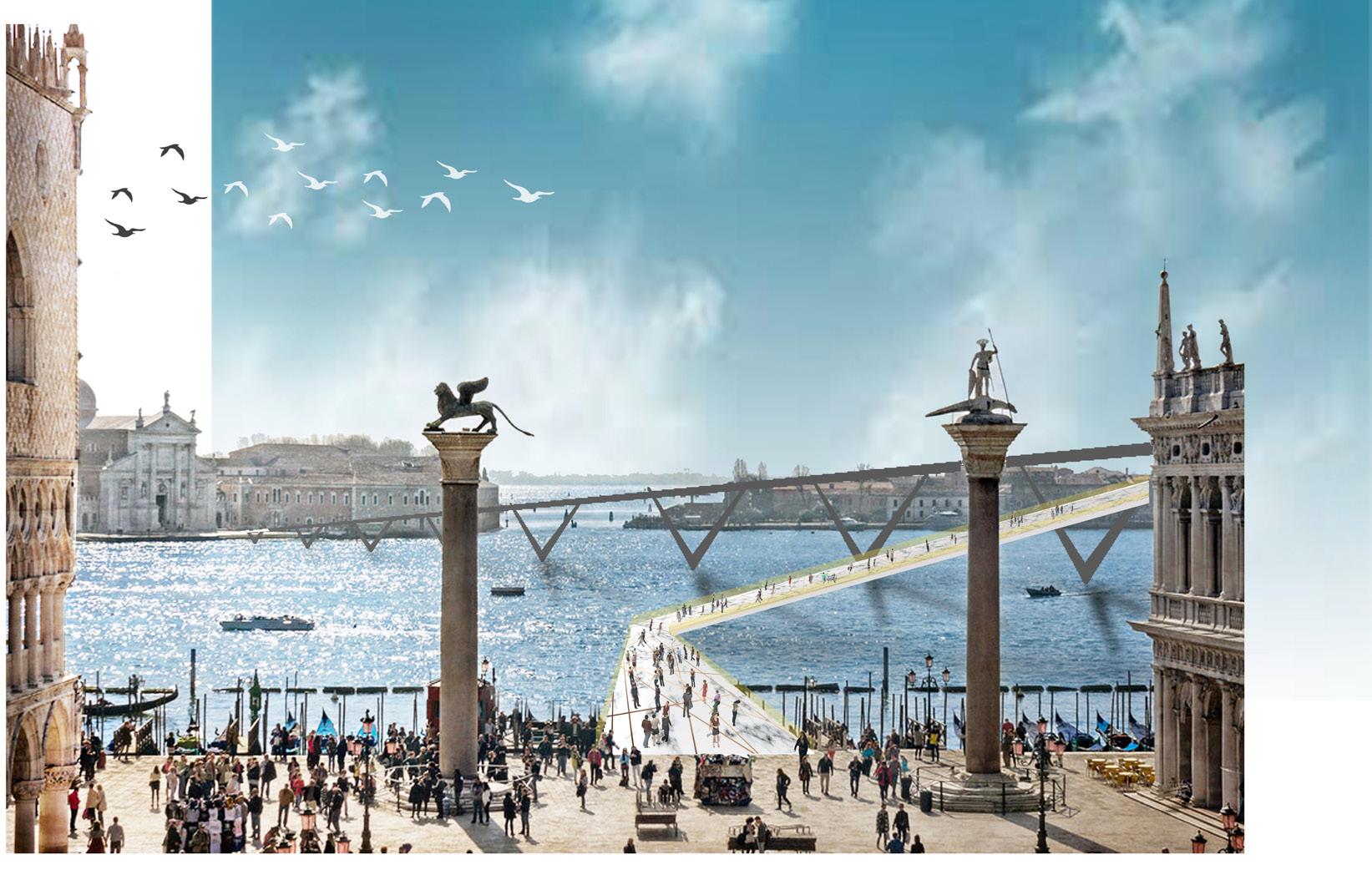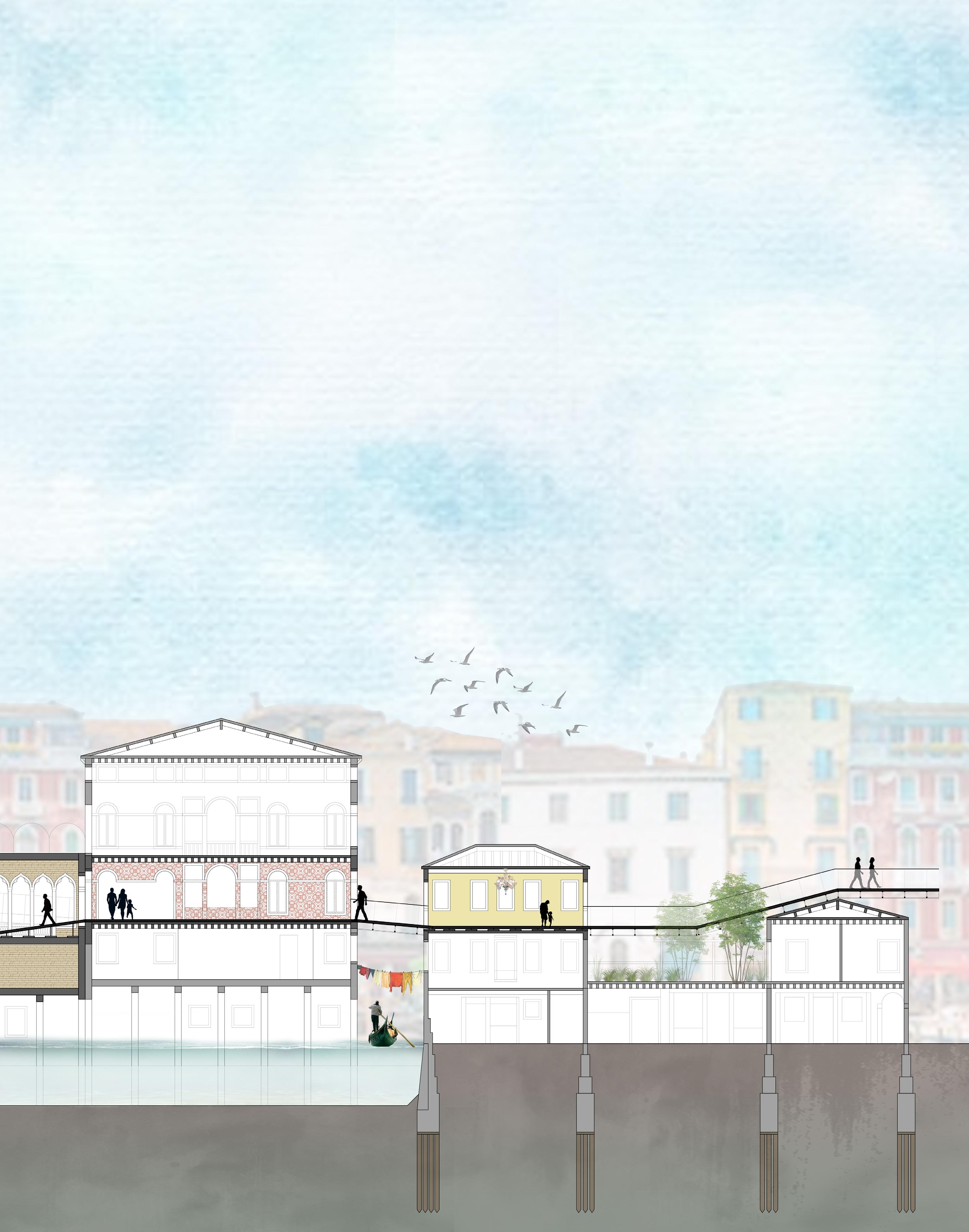 A preserved living relic of the past, the city of Venice is a unique architectural quandary for the modern age. Flooded by tourists and high tide, this famed island city struggles to maintain its socioeconomic stability, resident population, and cultural identity against the pressures of the global modern world. With no land for further expansion, and foundations set into the marshland of the lagoon, the urban fabric of the city is bounded to the confines of its canals and historic low-rise buildings. The declining city is in chaos and disarray, and in need of an uplifting gesture that will begin to turn the tide.