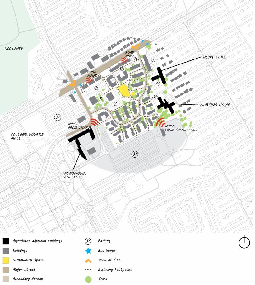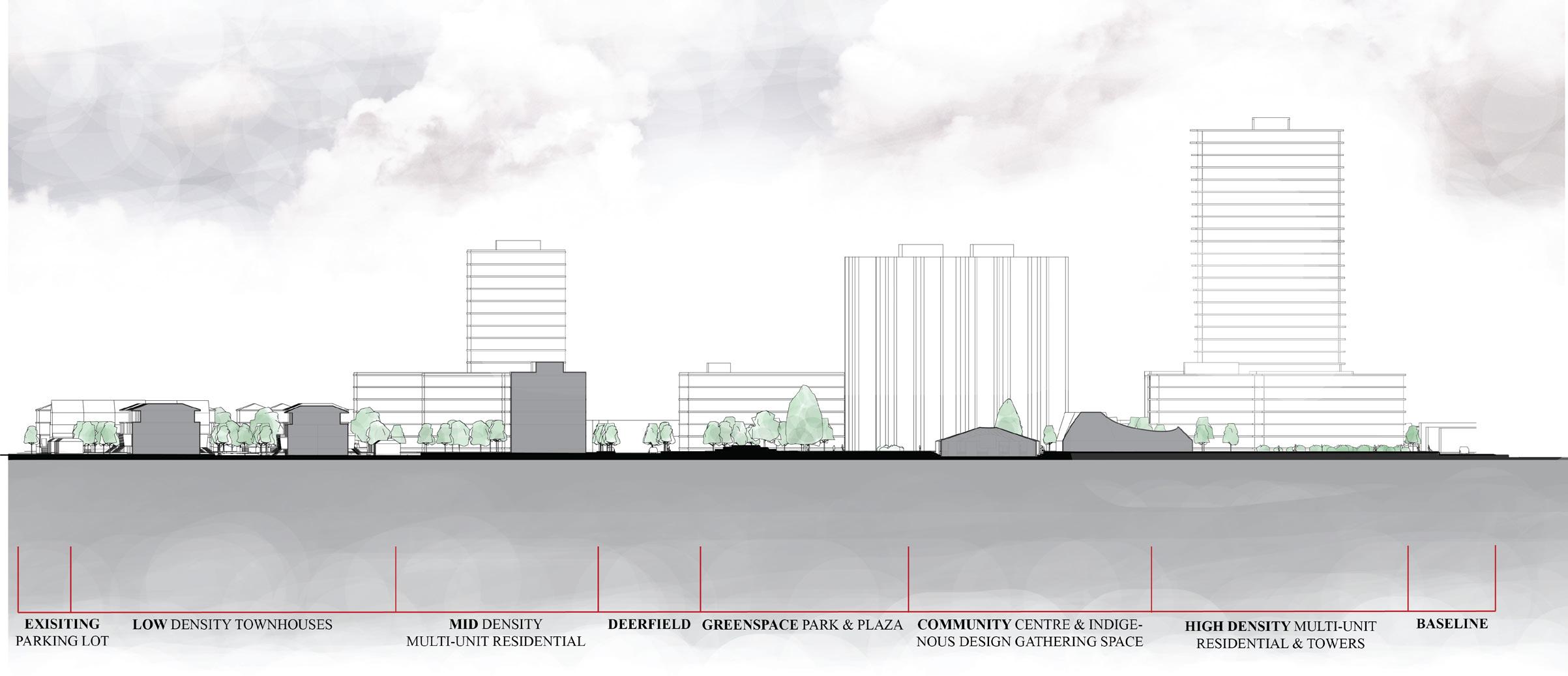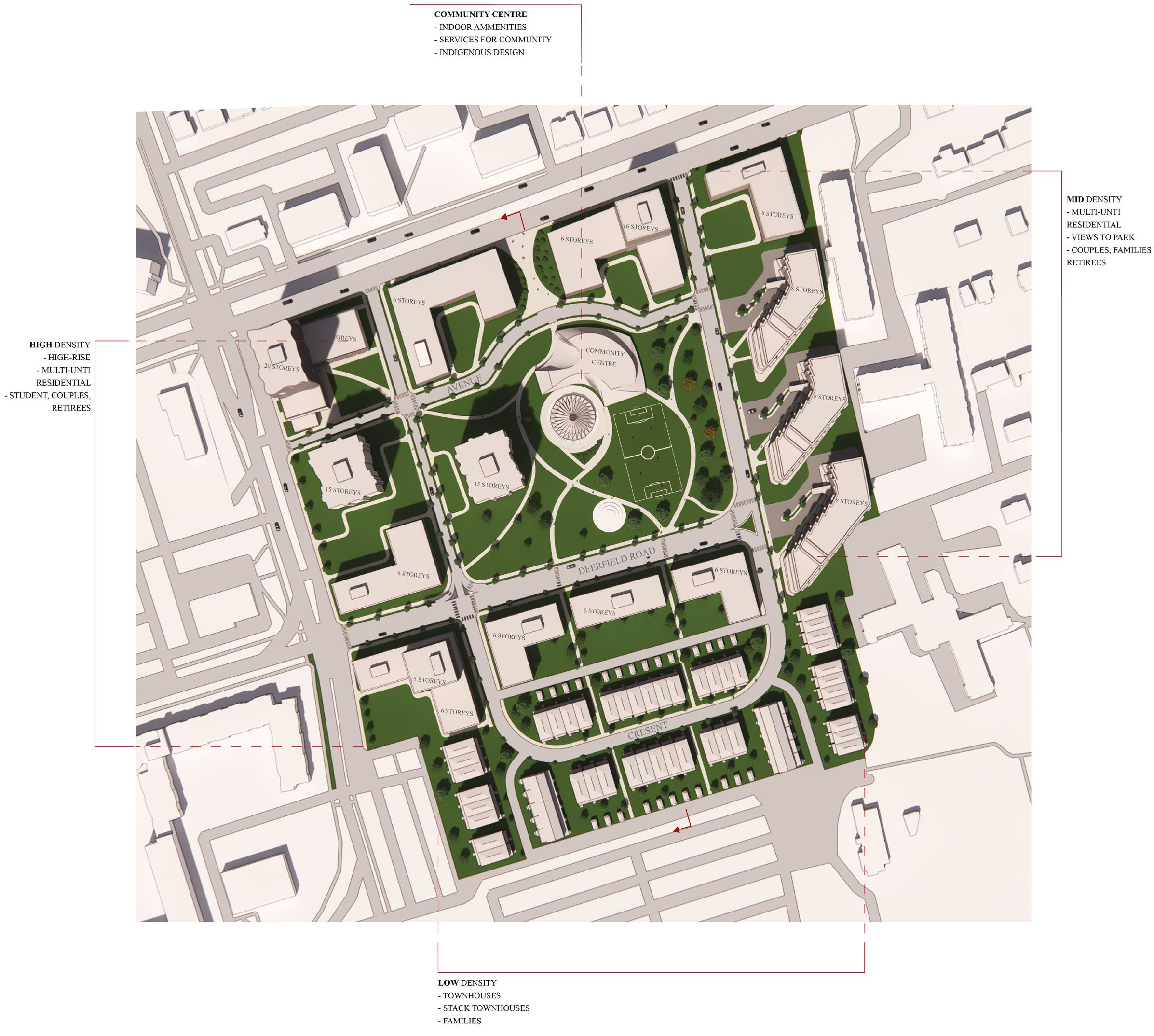 The purpose of this project was to increase the density of a small community in Ottawa, owned by Minto Development, by three times while preserving around 20% of the area as parkland. The goal was to accommodate both families and students in the same area by finding a balance between the two groups and the need for both developed and green spaces. The concept of yin and yang played a central role in the project, as we had to find a way to harmoniously integrate these opposing elements.