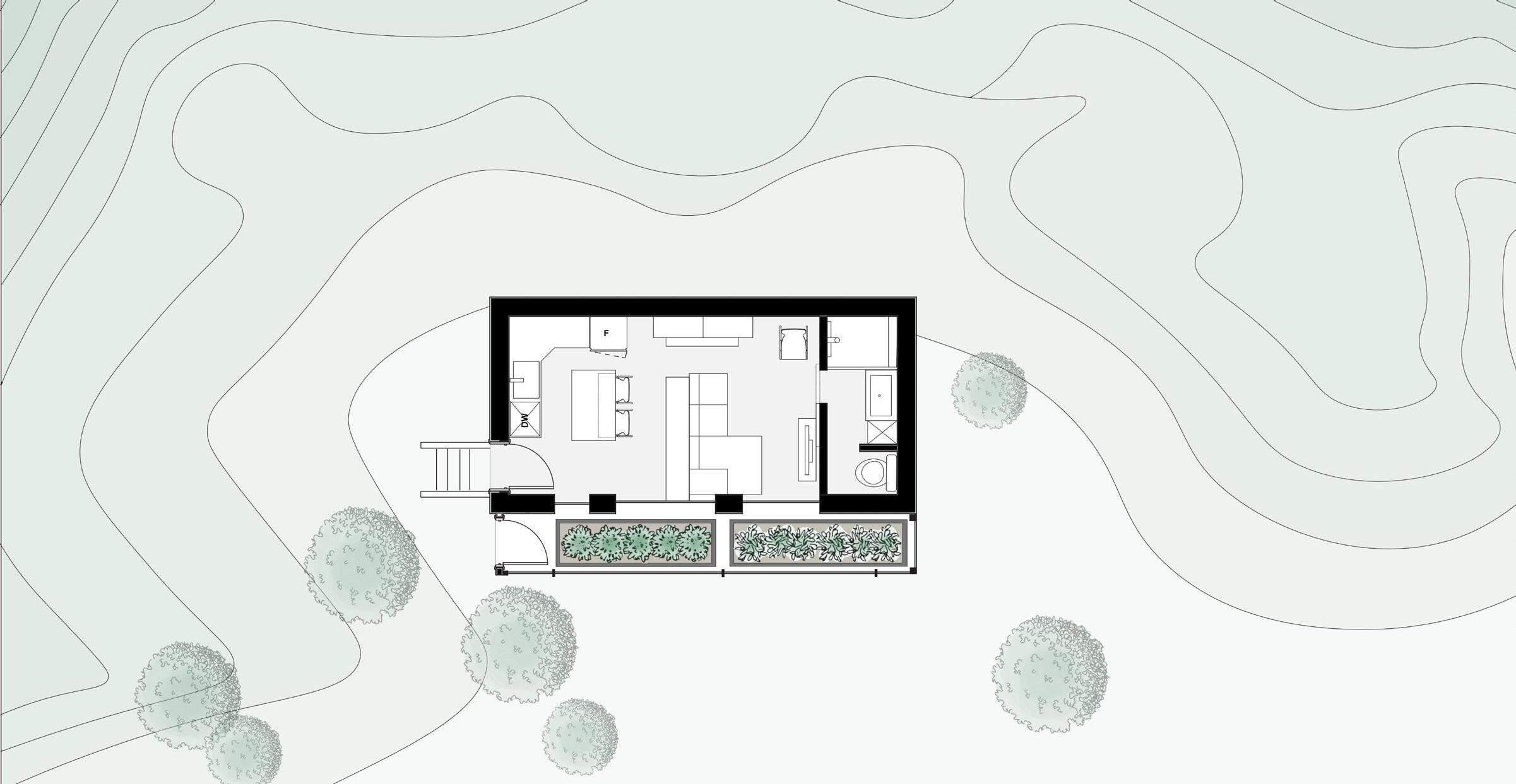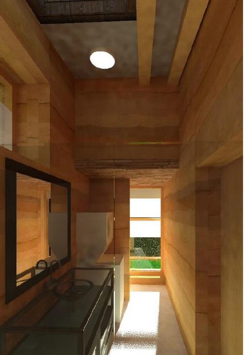 The opportunity to use rammed earth wall construction in this home allowed us to keep these walls exposed creating a unique and sensuous experience for the inhabitant. The placement of large windows on one side of the home provides ample lighting for the home while also capitalizing on the passive heating capabilities of the rammed earth walls.