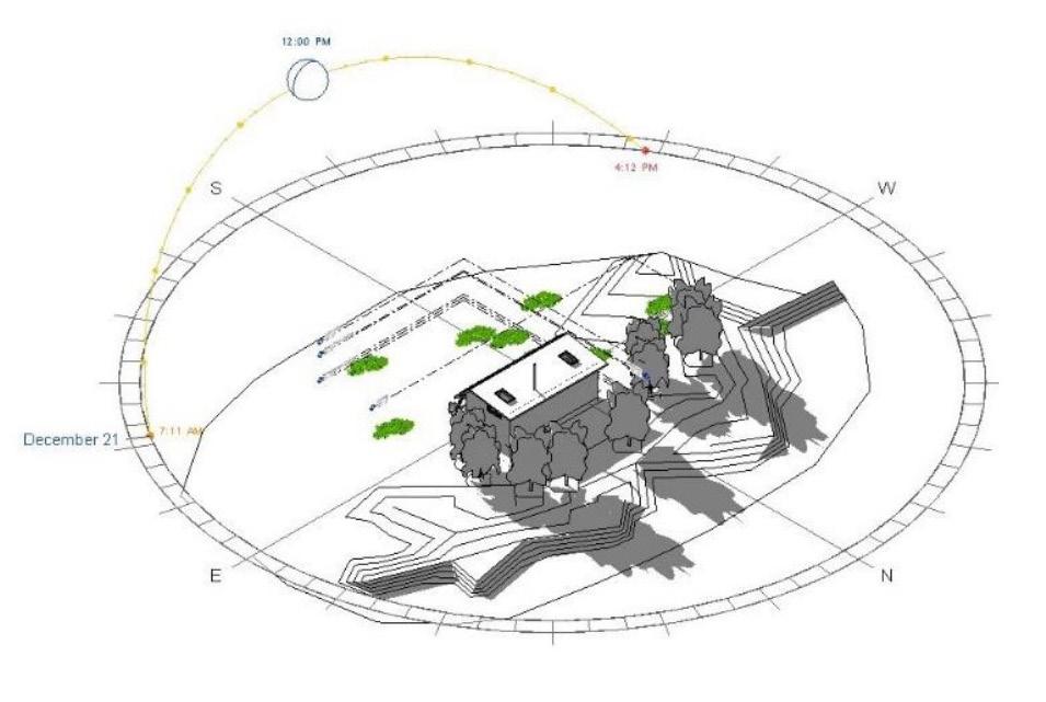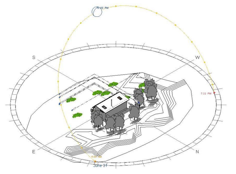 This Sun study was crucial to the building design for the feasibility of rammed earth construction as a form of passive heating. This was to ensure that the building could be embedded into the back of the slope behind the site, and that the sun could be sufficiently blocked from the interior space.