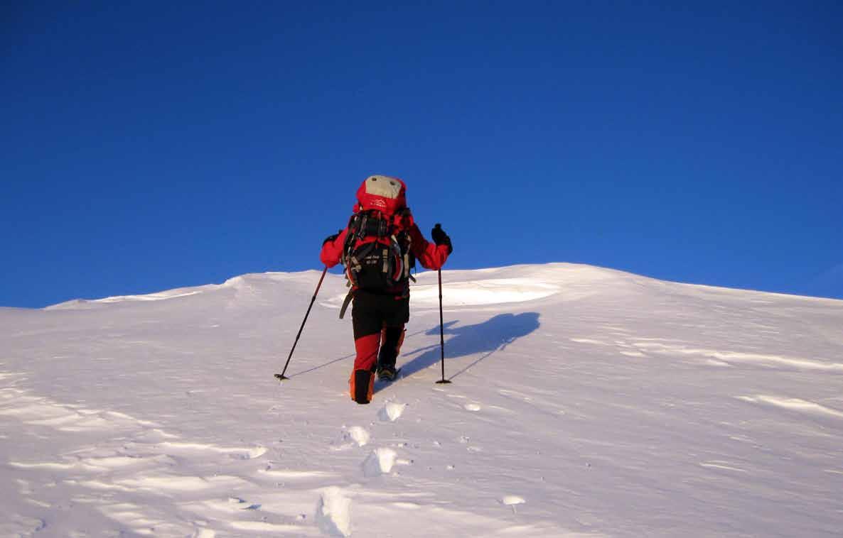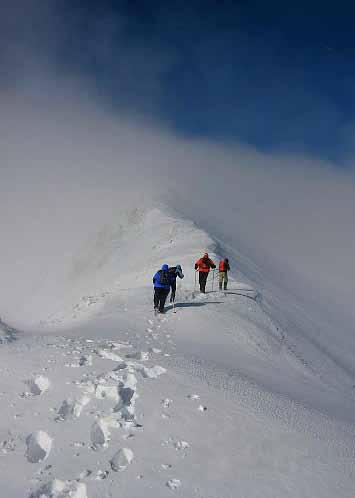 одиме по ивицата на остар срт како нож се до самиот врв. Величенствен пат со огромни стреи од северна страна и длабока провалија кон јужниот дел од сртот. Оваа делница бара голема внимателност поради јакиот ветер кој дува и скриените стреи и карпи наполнети со снег. На неколку пати застануваме кога времето е поволно и правиме по некоја