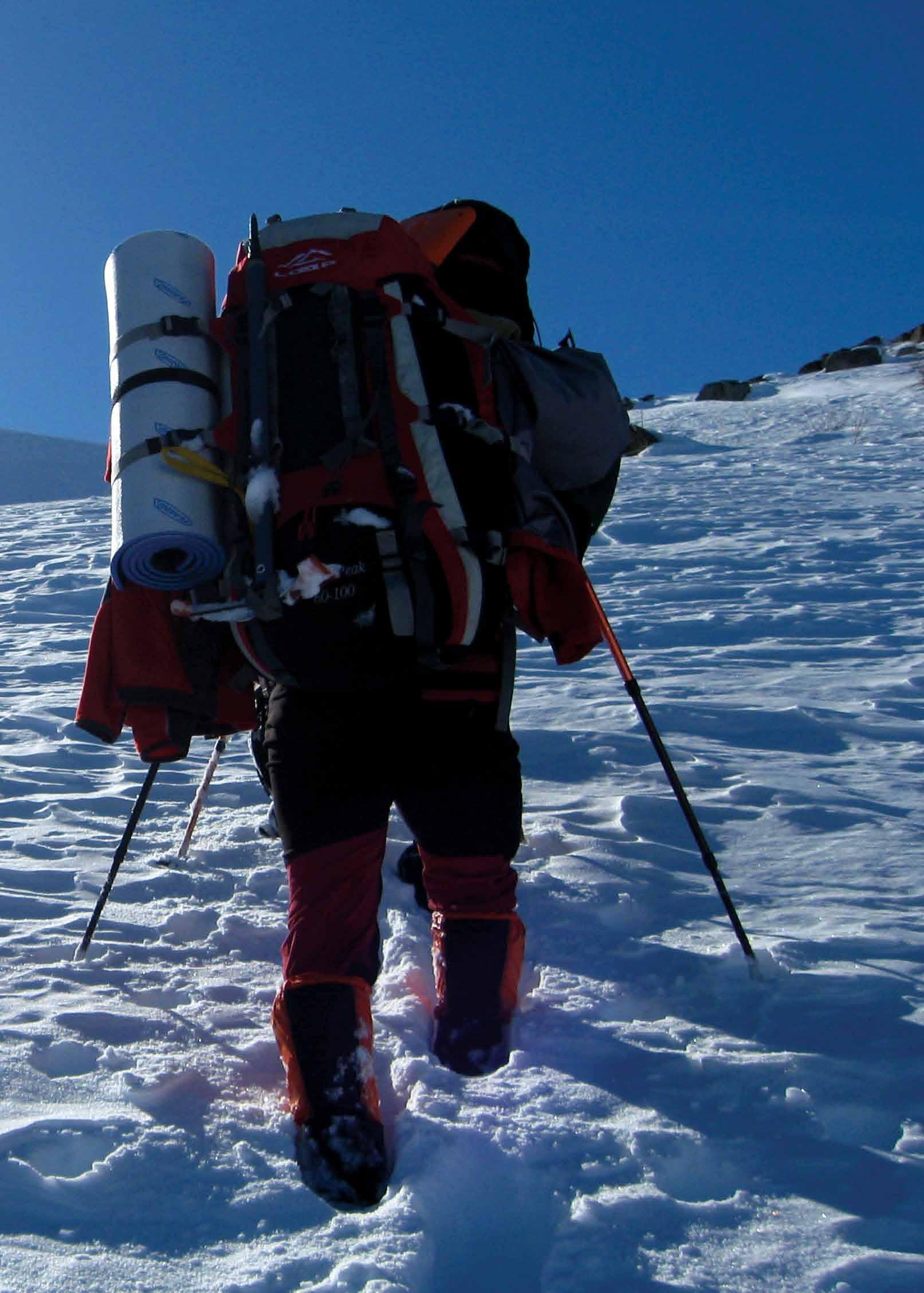 снег, симнување по стрмни и заледени површини каде постои опасност за пролизгување. Штеки за планинарење служат за намалување на оптеретеност на нозете (пред се колената) особено на долги тури. Телескопските штеки се троделни и се згодни при транспорт. Подлога за вреќа за спиење служи како топлотна изолација. Може да биде од различни материјали, како и на надувување. Вреќите за спиење во зависност од полнењето ги делиме на синтетички и пернати или летни и зимски. Шатори се делат на повеќе категории во зависност од потребите. За нас се најинтересни повеќе сезонски шатори. Тие по правило се потешки, имаат подобра изолација, краевите се со продолжен дел врз кој може да натрупаме снег или камења заради осигурување на истиот. Списокот на опрема е прилично долг, а за таа цел во секој нареден број ќе ве запознаваме со дел од опремата, како и со прикази и тестови на некои од нив.