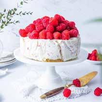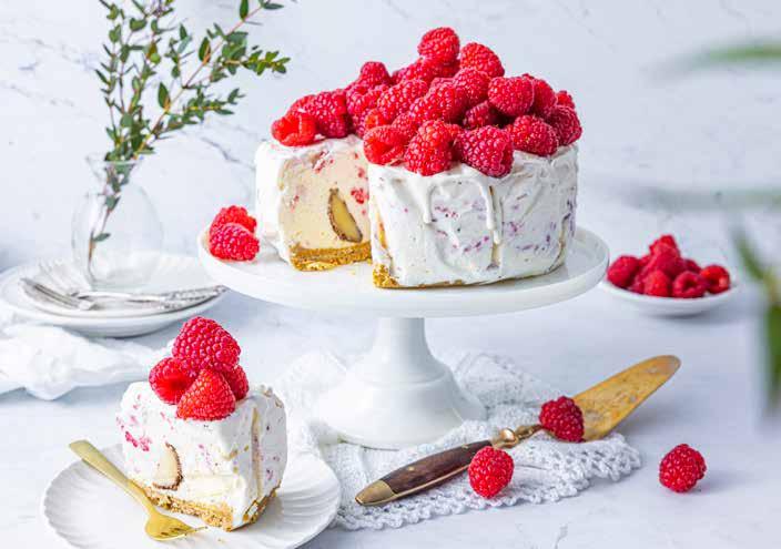 Ο Ha ismassen over i kakeformen, oppå kjeksbunnen. Skjær marsipanbrødet i 2 cm tykke skiver. Stikk marsipanbiter ned i ismassen. Dekk til iskaken og sett den i fryseren natten over eller til den stivner. Pynt med friske bringebær ved servering.