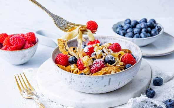 Ο Server pannekakespagettien med friske bær og et dryss med melis.