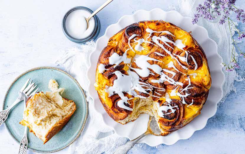 Ο Smør et tykt lag vaniljekrem på toppen av deigen som ligger i kakeformen. Fordel kanelbollene så tett som mulig rundt i formen med snittflatene opp. Med en skje eller sprøytepose fylles tomrommene mellom kanelbollene og sidene der det trengs. Dekk til formen med plast og la heve i 15 min.