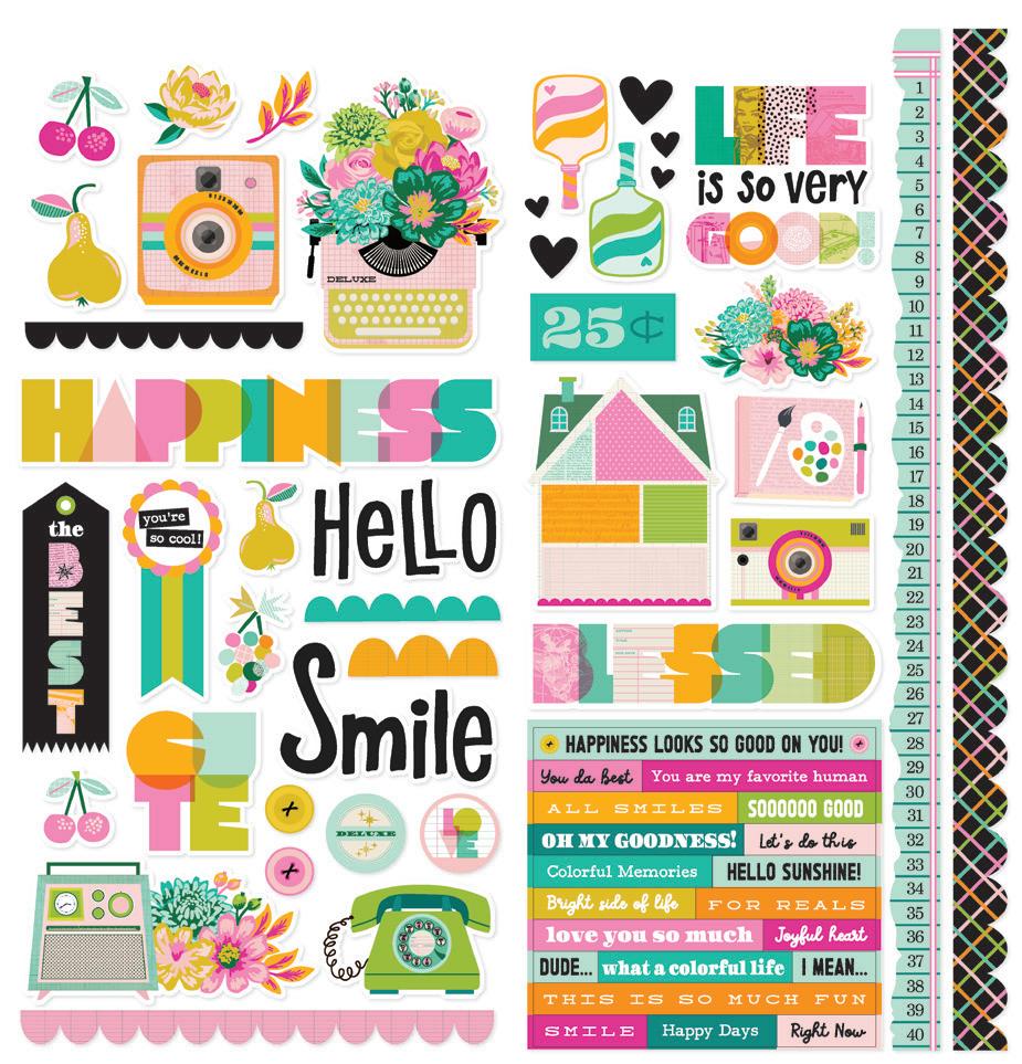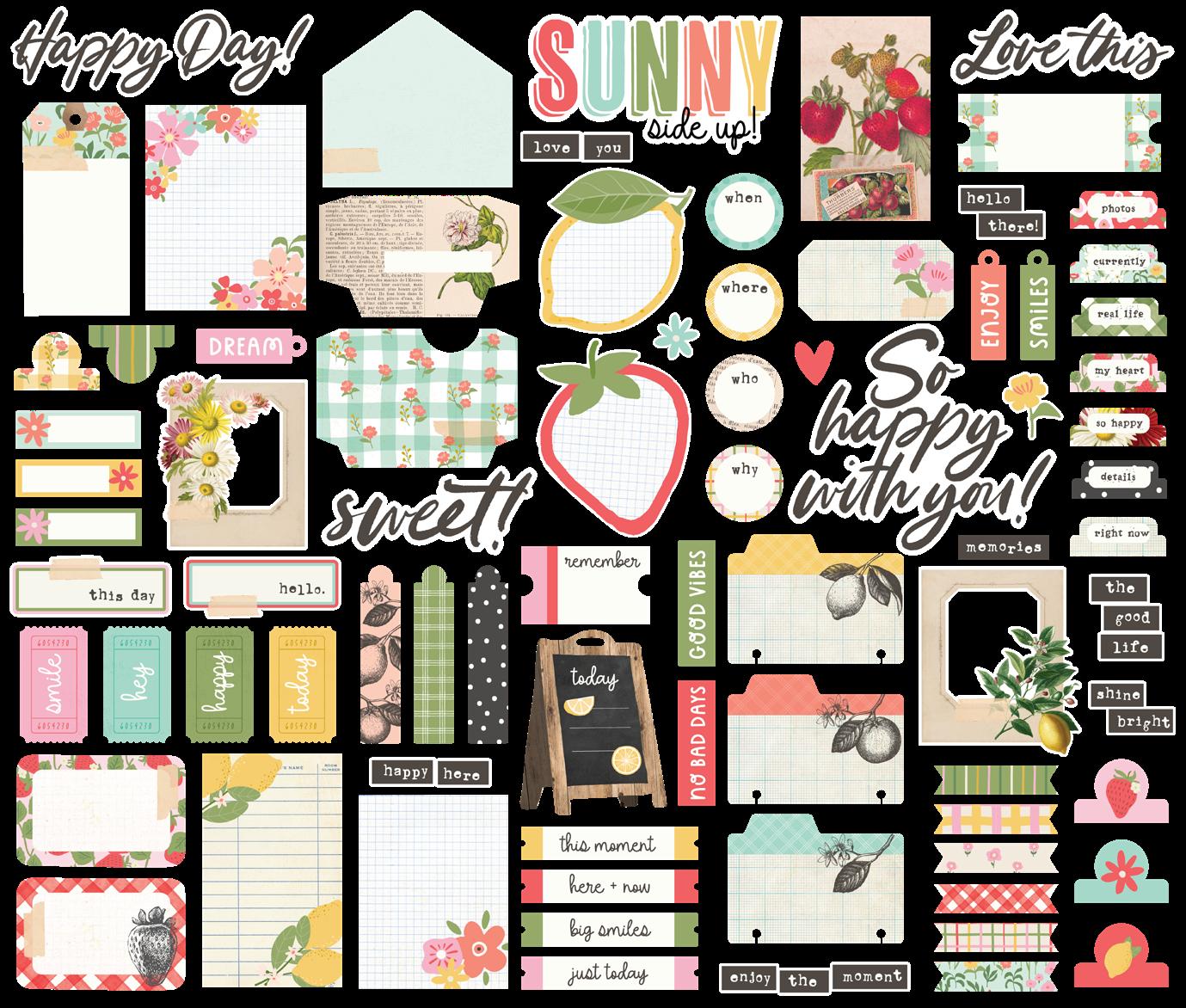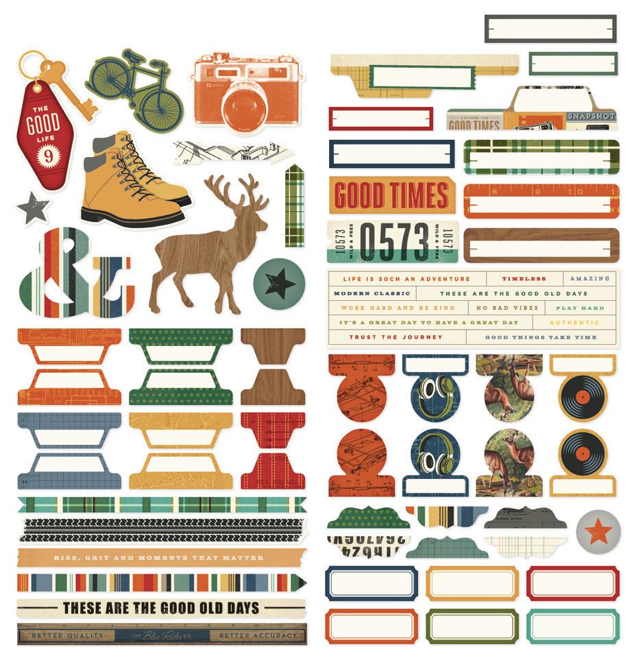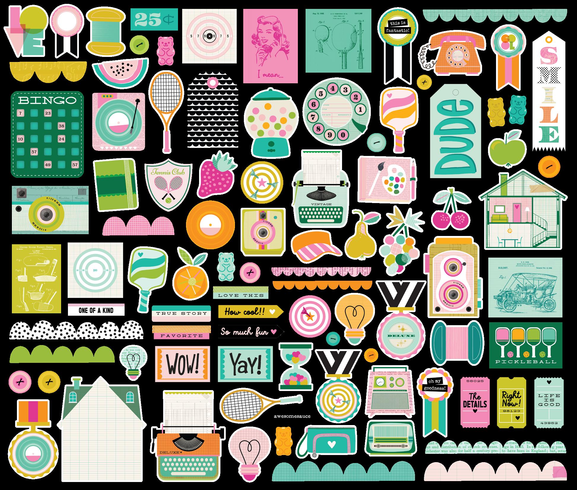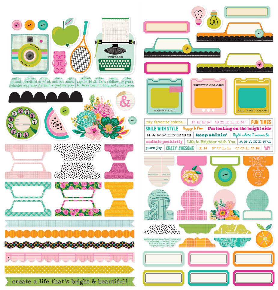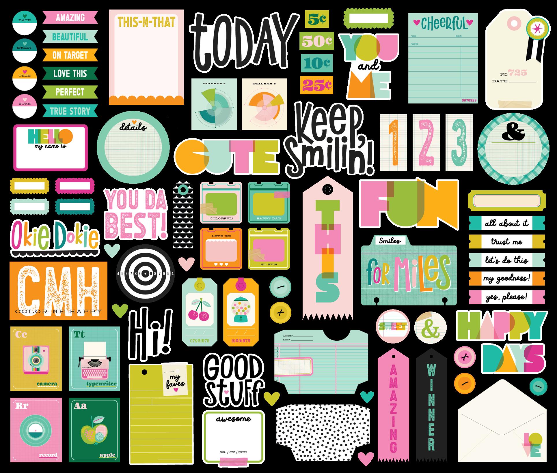 Cardstock including cut apart Tags and Element Sheets, 12x12 Cardstock Sticker Sheet - Icons (57), 12x12 Cardstock Sticker Sheet - Basics (72), Journal Bits (84), Page Pieces (23); 248 pieces