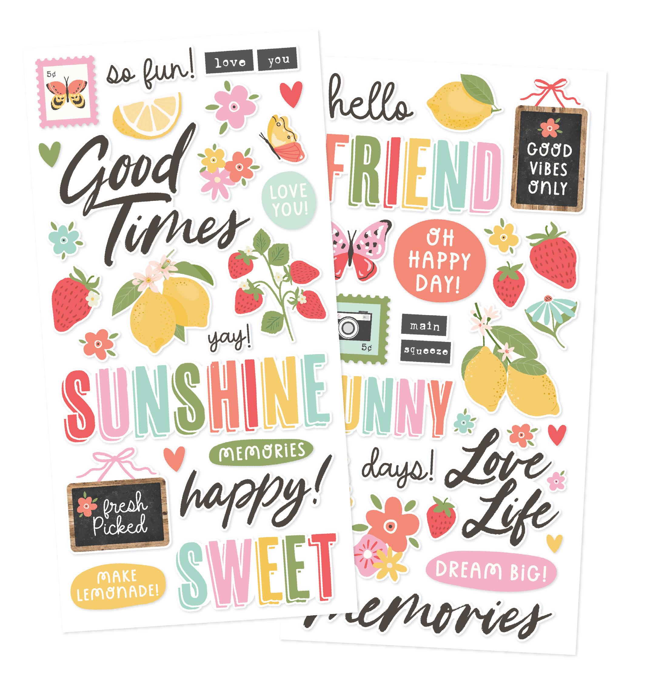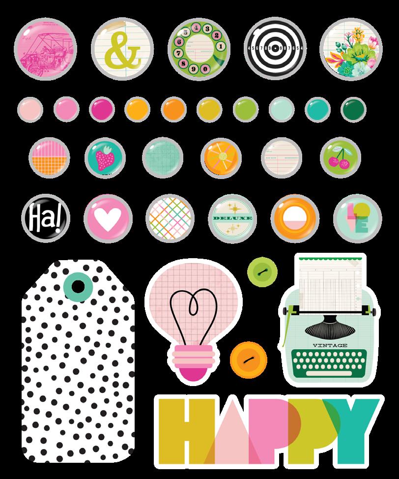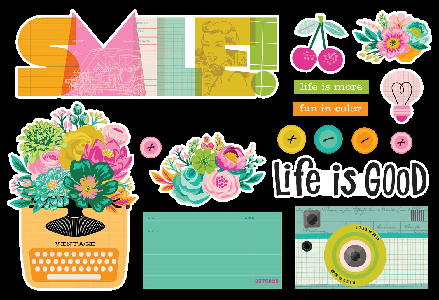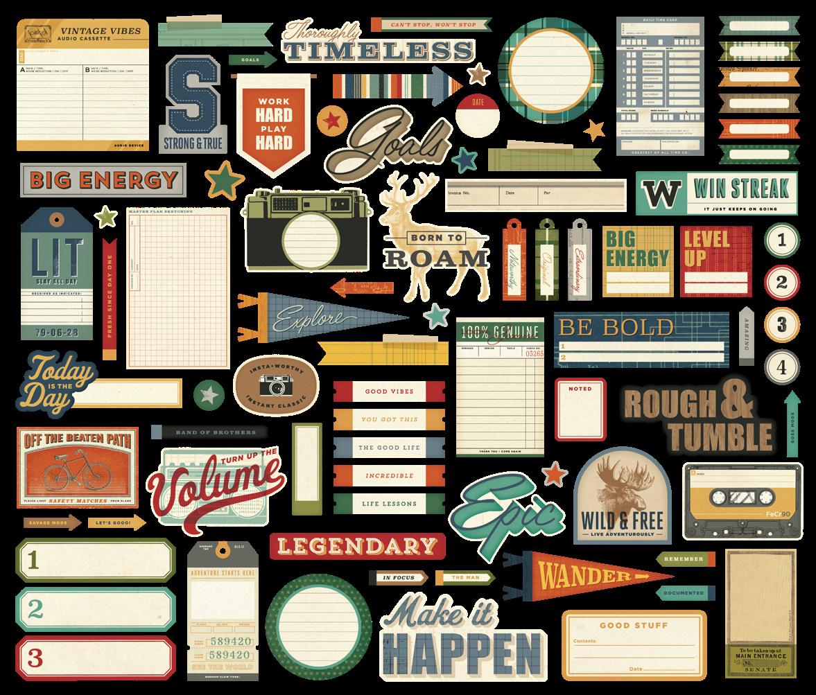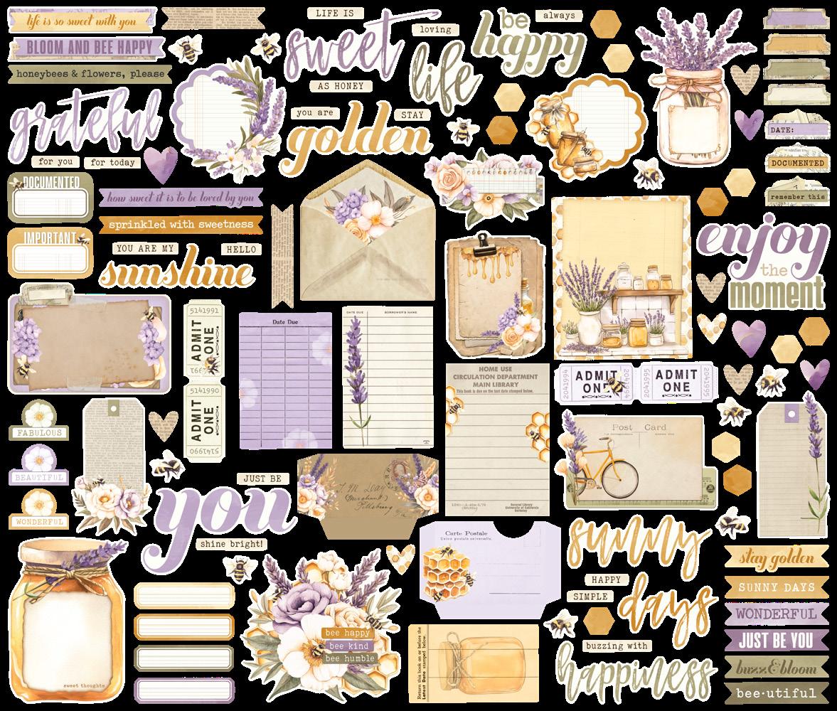 Cardstock including cut apart Tags and Element Sheets, 12x12 Cardstock Sticker Sheet - Icons (57), 12x12 Cardstock Sticker Sheet - Basics (72), Journal Bits (84), Page Pieces (23); 248 pieces