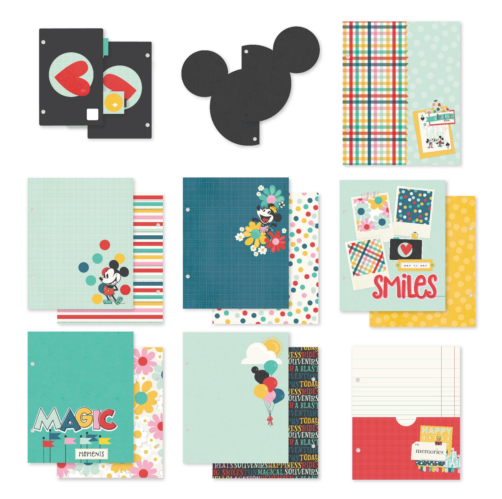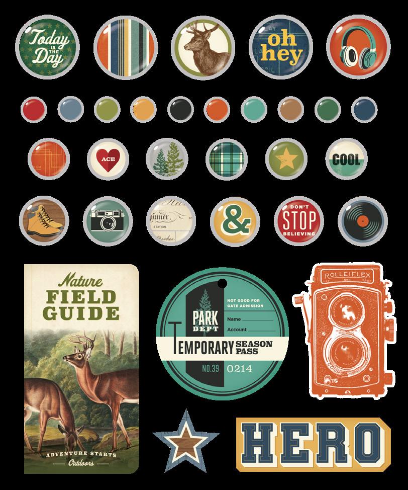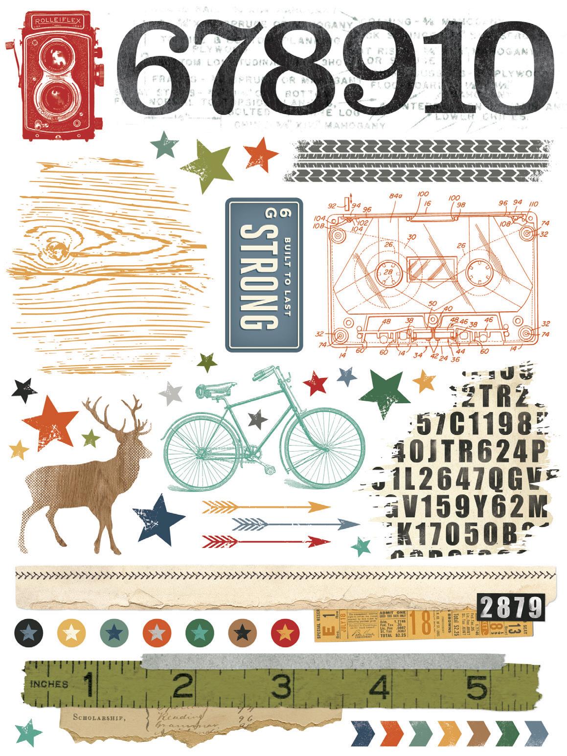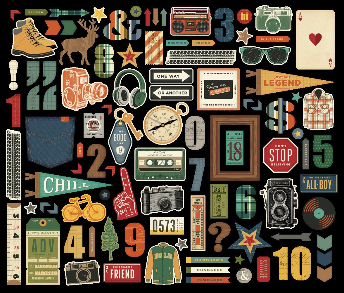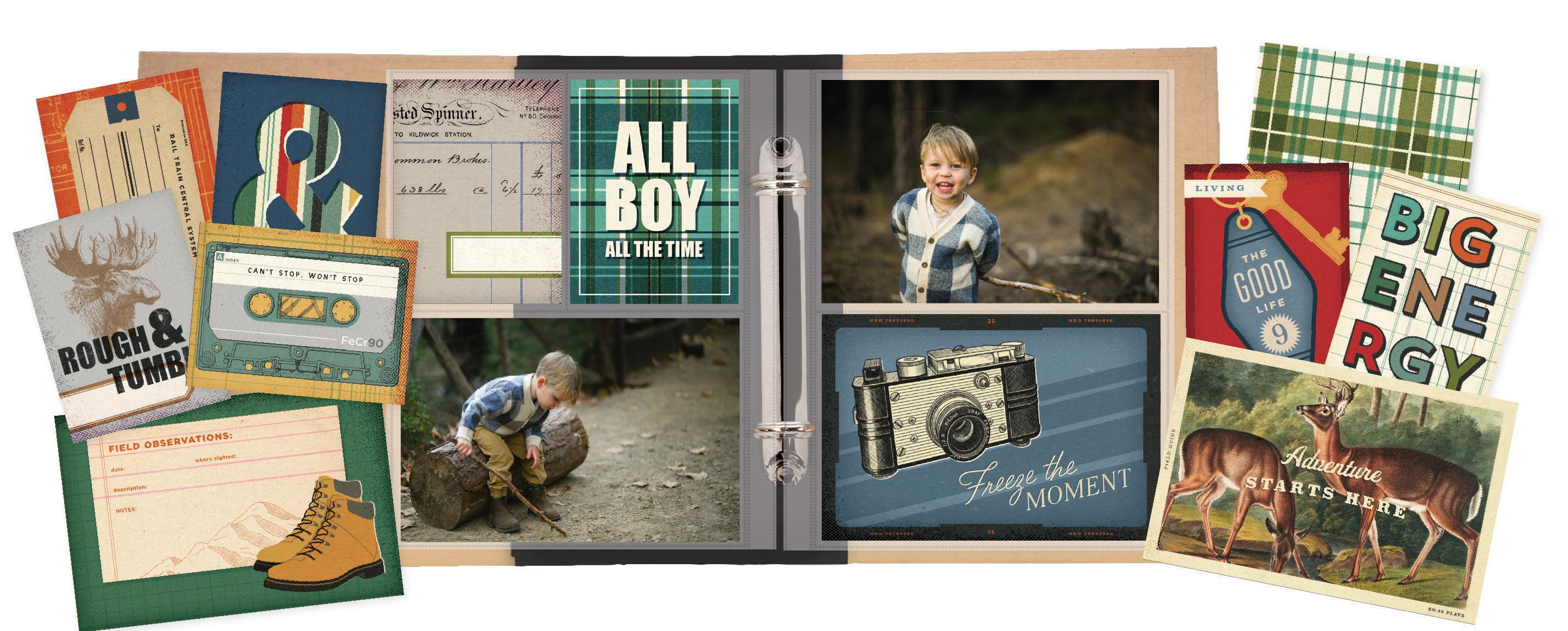 Everything you need to create 12 double-page scrapbook layouts. No cutting required! Quick and easy scrapbooking - just add photos and adhesive! Add your own twine, enamel dots, decorative brads, or foam adhesive for additional dimension.