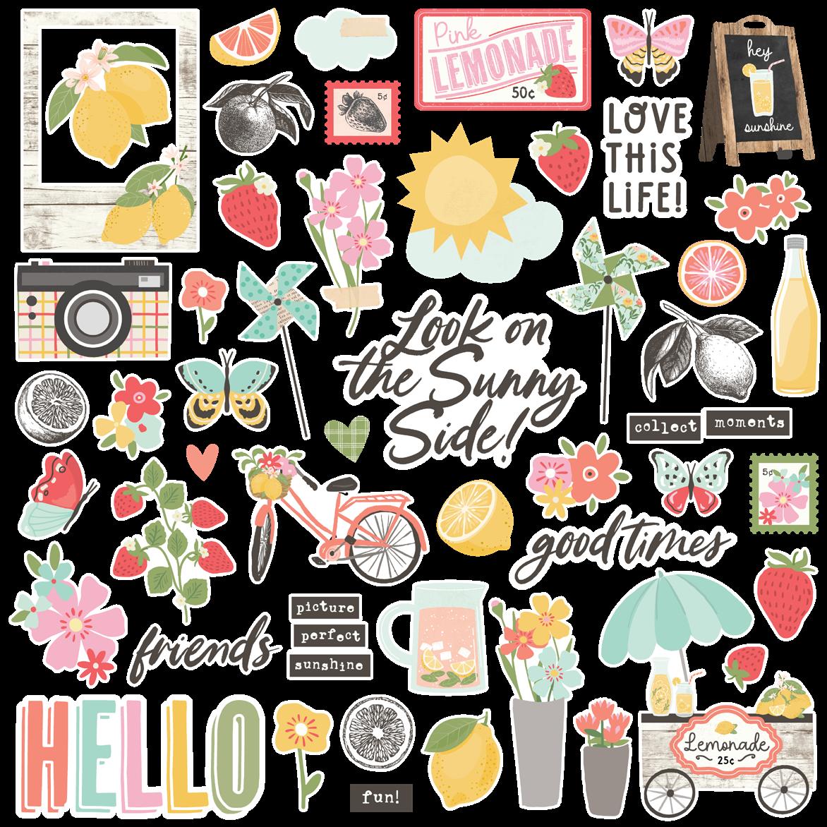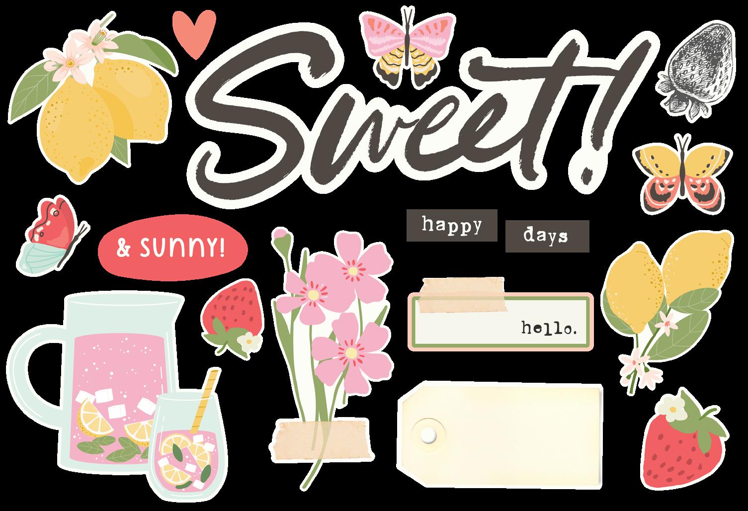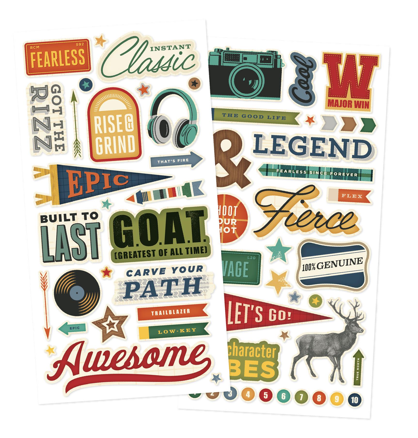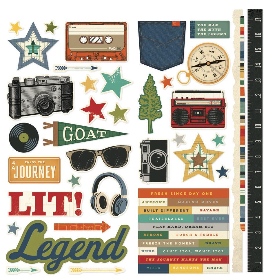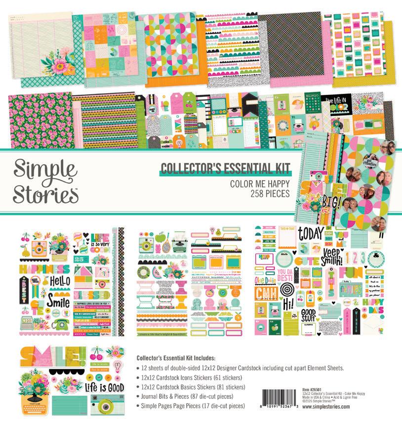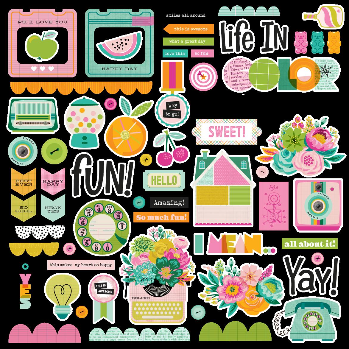 Cardstock including cut apart Tags and Element Sheets, 12x12 Cardstock Sticker Sheet - Icons (61), 12x12 Cardstock Sticker Sheet - Basics (81), Journal Bits (87), Page Pieces (17); 258 pieces