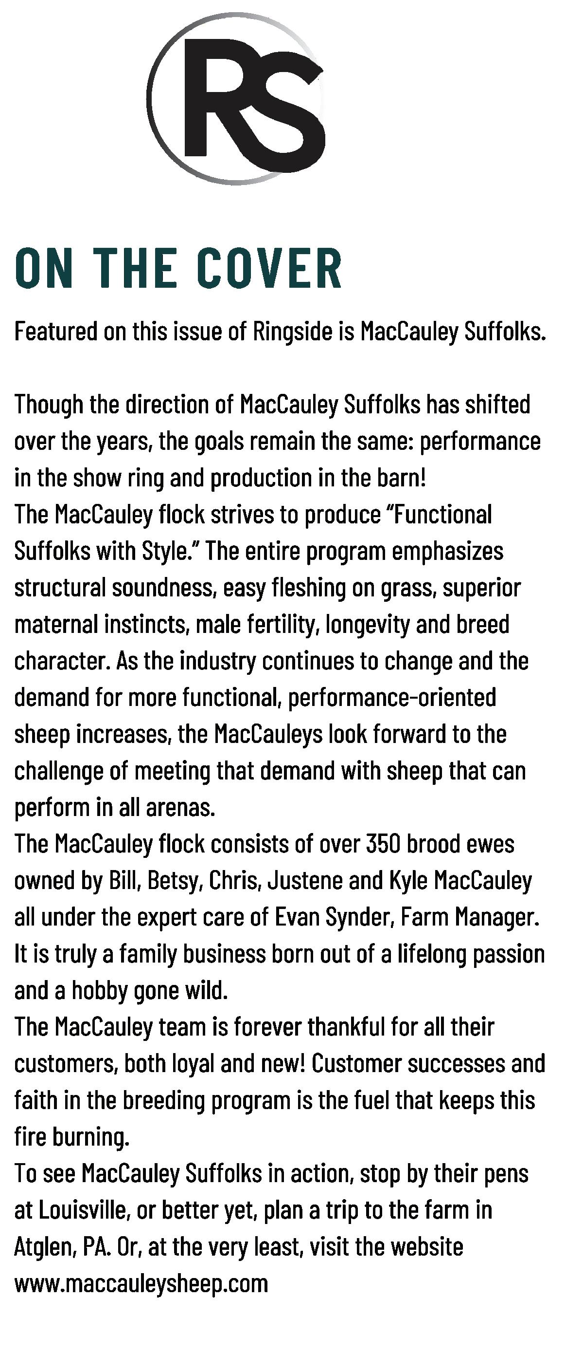 Featured on this issue of Ringside is MacCauley Suffolks.Though the direction of MacCauley Suffolks has shifted over the years, the goals remain the same: performance in the show ring and production in the barn! The MacCauley flock strives to produce “Functional Suffolks with Style.” The entire program emphasizes structural soundness, easy fleshing on grass, superior maternal instincts, male fertility, longevity and breed character. As the industry continues to change and the demand for more functional, performance-oriented sheep increases, the MacCauleys look forward to the challenge of meeting that demand with sheep that can perform in all arenas.