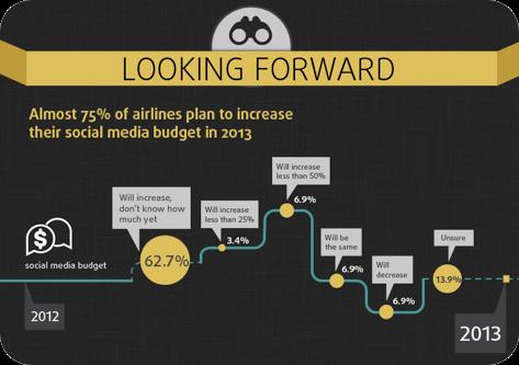 • Over 70% of the airlines surveyed plan to increase their social media budget in the next year. This is almost a two-fold increase compared to a year ago when only 40% of the airlines surveyed planned to expand their social media teams.