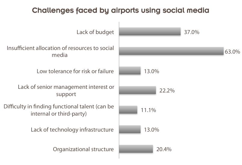 • The biggest challenge faced by airports is the insufficient allocation of resources to social media. The next biggest challenge is the lack of budget.