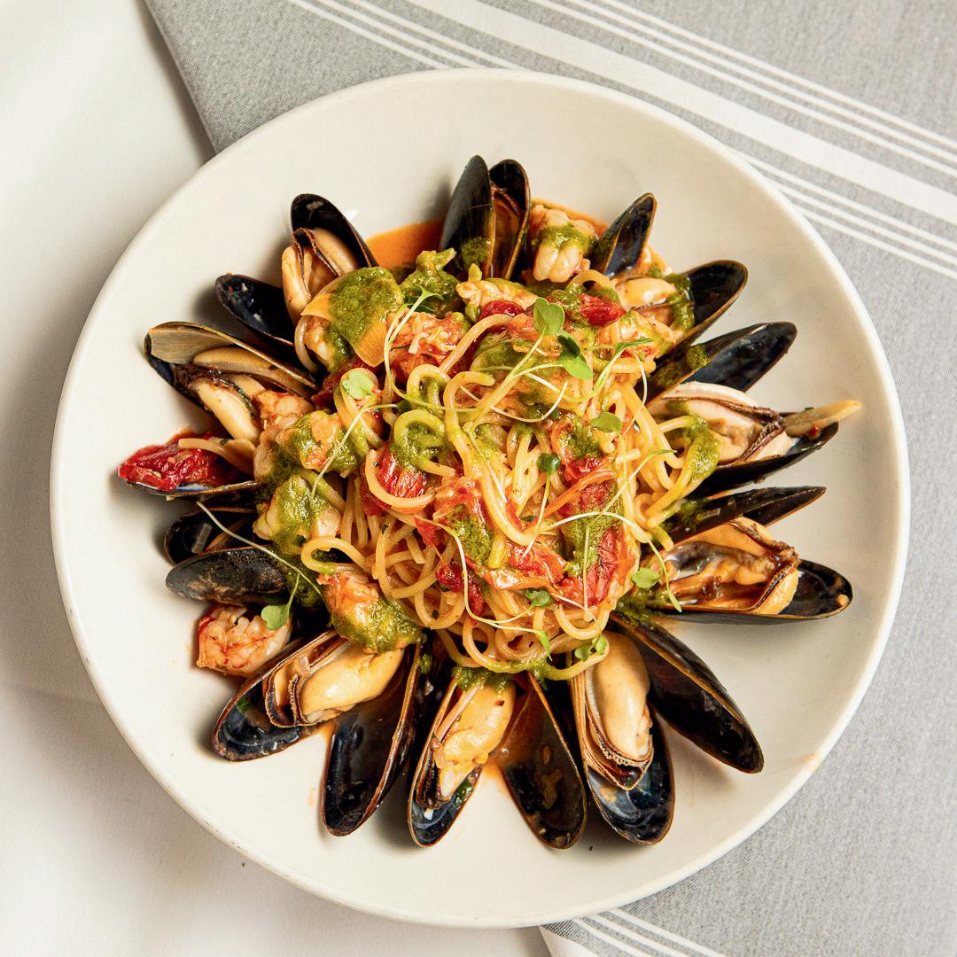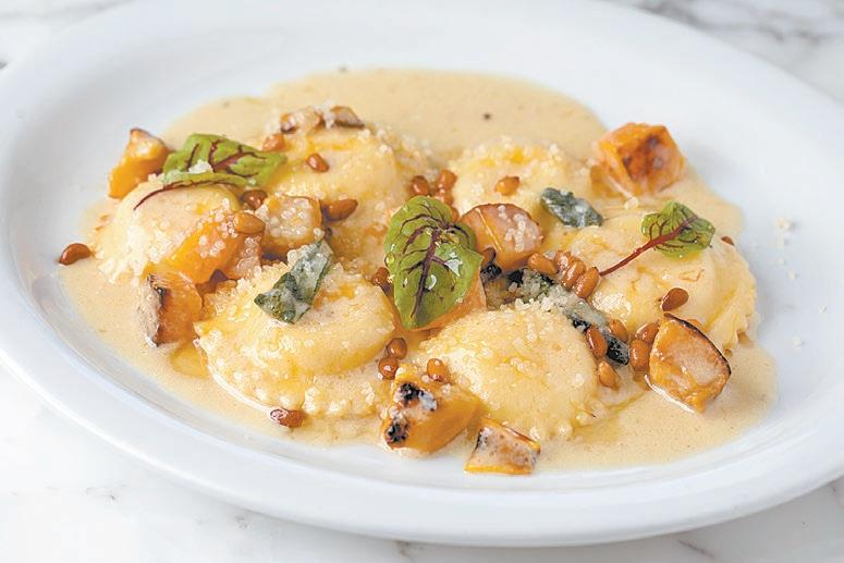 menu showcases classic, seasonal and regional Italian dishes. Fresh pasta is made overlooking the dining room during service. Spaghetti and meatballs present al dente pasta and fork-tender spheres of ground duck, turkey and beef. “Crazy lasagna” layers braised short ribs with sheets of pasta, drizzled with garlic and rosemary juice for yummy umami. Chicken parmigiana is so big it fills the plate. Pizza, made by Pizzaiolo Brendan Keenan, features a Neapolitanstyle thin crust that’s cooked through; one bite of margherita is all that’s needed to be impressed. The wine list showcases varietals and blends from around the world, including several Italian picks. Beer and classic and creative cocktails are also offered. Save room for tiramisu or hazelnut chocolate bars.
