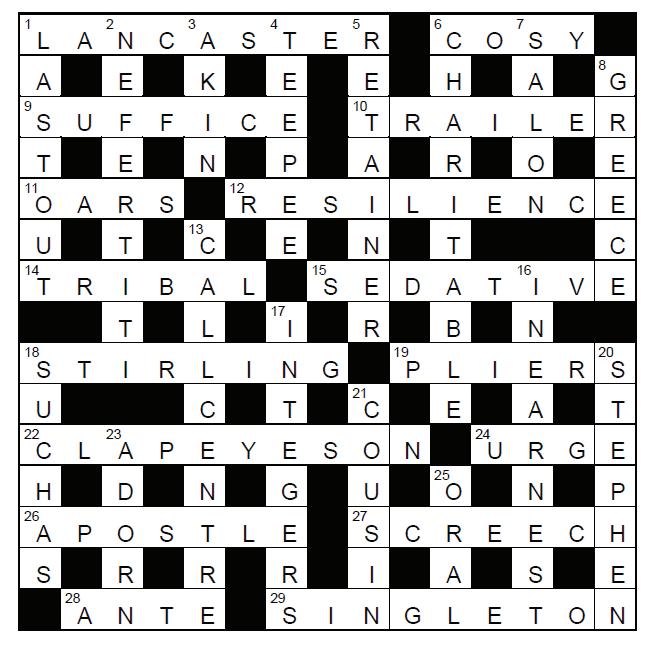 ACROSS 1 Lancaster. 6 cosy. 9 suffice. 10 trailer. 11 oars. 12 resilience. 14 tribal. 15 sedative. 18 Stirling. 19 pliers. 22 clap eyes on. 24 urge.