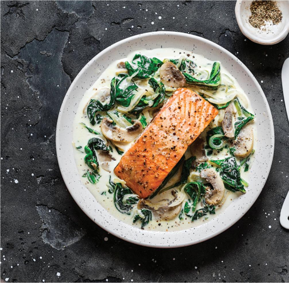 Pour the creamy spinach and mushroom mixture over the salmon. Serve with a green salad