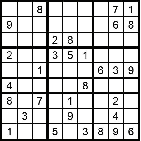 Fill in the grid so that each row, column and 3x3 box, contains the numbers 1 through to 9 with no repetition.