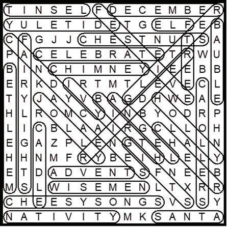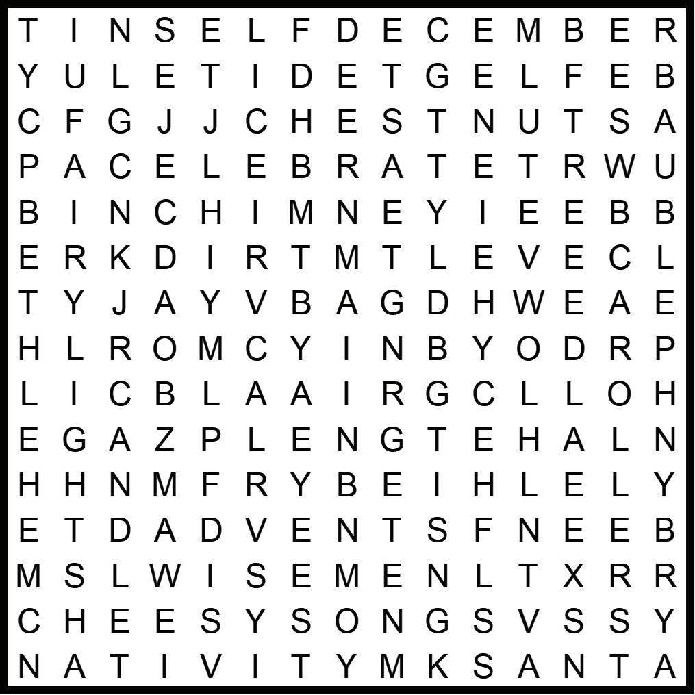 Cheesy songs Chestnuts Chimney December Elf Fairy lights Festive Gifts Glitter Holly Ivy Jolly Nativity Reindeer Santa Tinsel Tree Wise men Yuletide