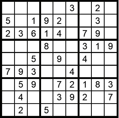 Fill in the grid so that each row, column and 3x3 box, contains the numbers 1 through to 9 with no repetition.