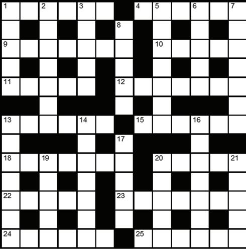 Across 1 Scottish plaid (6) 4 Entice, coax (6) 9 Shape with many sides (7) 10 Circulate, deliver (5) 11 Grovel (5) 12 Spiky plant (7) 13 Calendar, schedule (6) 15 Despot, bully (6) 18 Touchable (7) 20 Scrutinise (5) 22 Pretended (5) 23 Teeming, jammed (7) 24 Victim, prey (6) 25 Delicate, fragile (6)