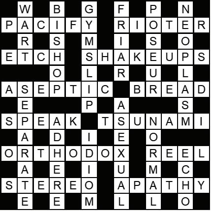 Across 7 Assuage, soothe (6) 8 Insurgent, mutineer (6) 9 Inscribe (4) 10 Disturbances, upsets (5-3) 11 Sterile (7) 13 Food staple (5) 15 Chat, utter (5)