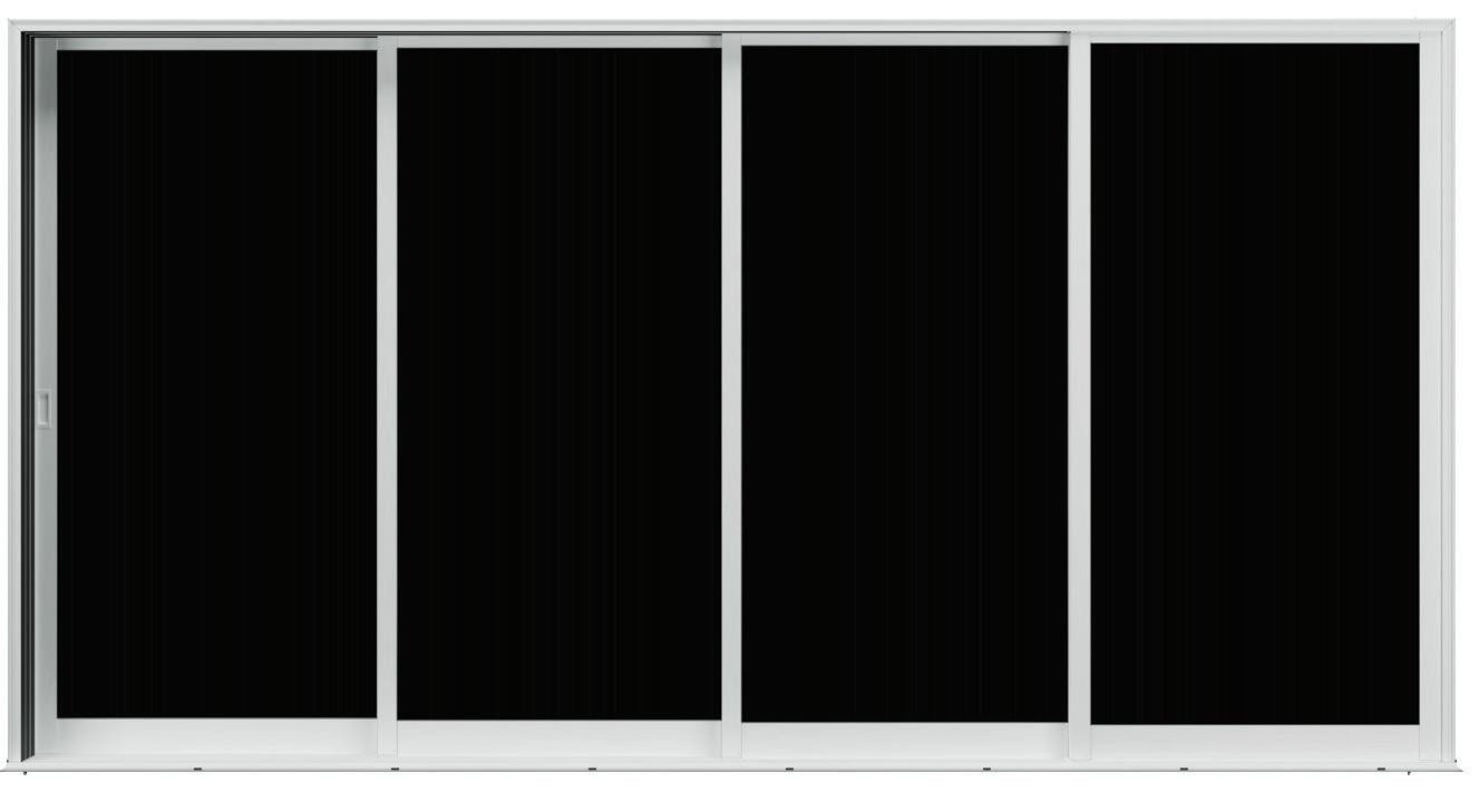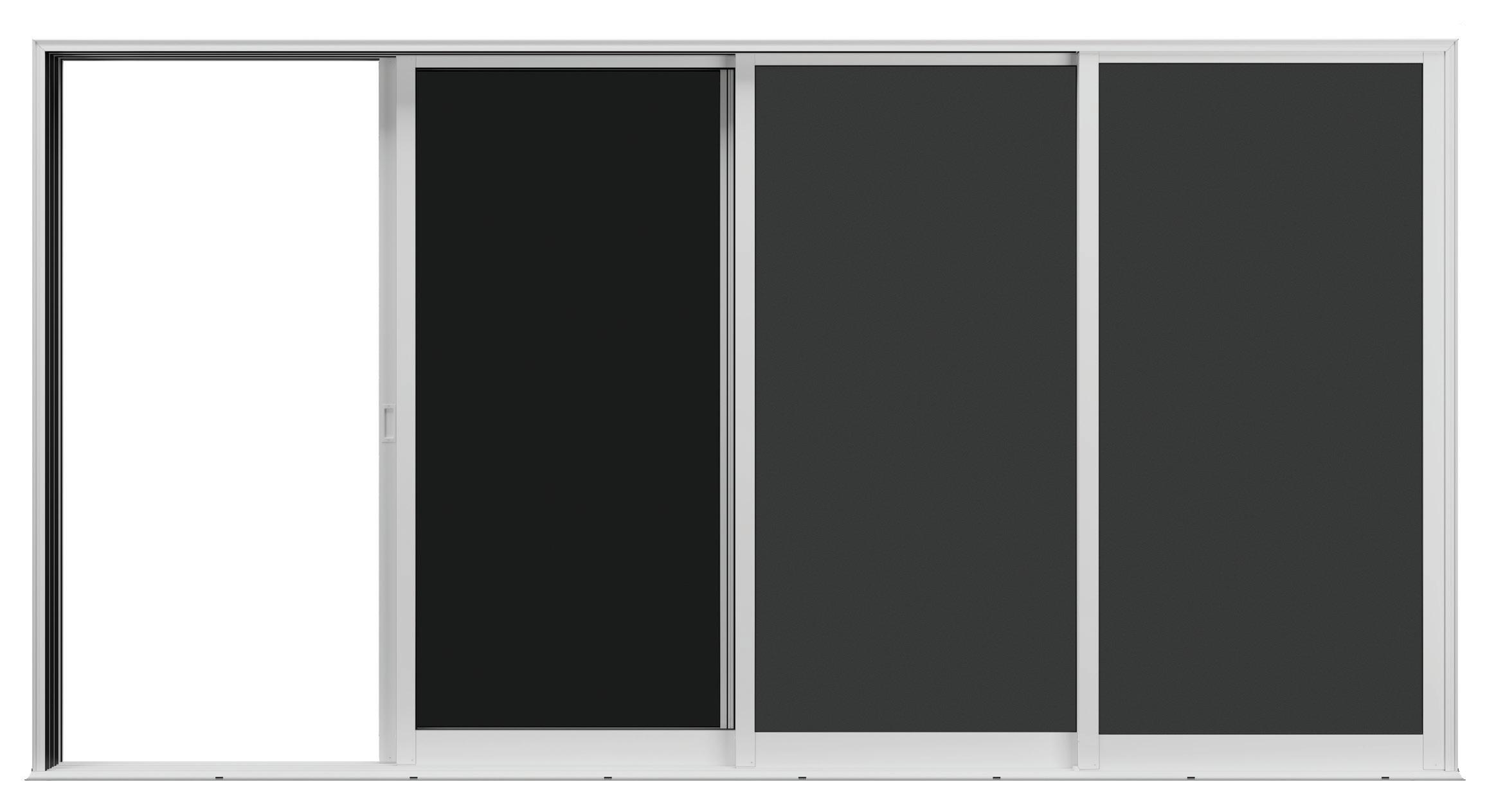 All four panels slide into a pocket to the right. All four panels slide into a pocket to the left.