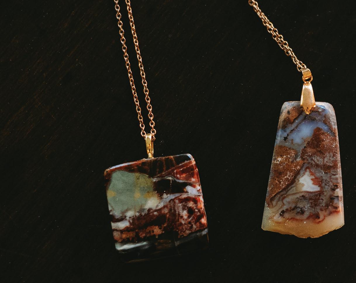 Jim finds inspiration for his pieces all over. “Sometimes, I’ll see a picture, and I’m like- I could make that! So, I hand draw it, then cut it out, and see what happens.” Pullout quote? Around 90% of Jim's stones are self-collected, and he curates the rest of his materials locally as often as possible. He creates all of his pieces at home in his shop. “Start to finish, I do it all,” states Jim.
