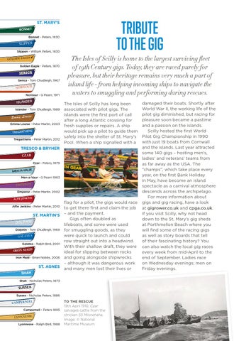 flag for a pilot, the gigs would race to get there first and claim the job ST. MARTIN'S – and the payment. Gigs often doubled as DO LP HI N lifeboats, and some were used Dolphin - Tom Chudleigh, 1969 for smuggling goods, as they were quick to launch and could GA LA TE A row straight out into a headwind. Galatea - Ralph Bird, 2001 With their shallow draft, they were IRON MAID ideal for slipping between rocks Iron Maid - Brian Nobbs, 2006 and going alongside shipwrecks – although it was dangerous work ST. AGNES and many men lost their lives or